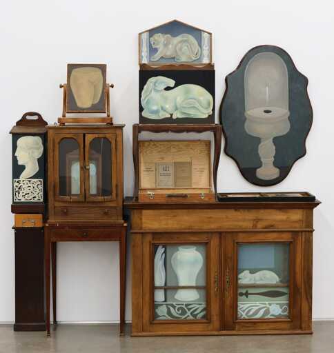 Shuo Hao works with antique furniture, typically sourced from auctions and second-hand shops. Wood worn with age is her preferred material, and most objects she selects date between the 16th and 20th centuries. Like much of her practice, choosing these objects emerges more from intuition rather than a desire for particular physical qualities. Focusing on their surfaces, she paints a paints a panel or door, transforming both prized and forgotten pieces into surreal works.