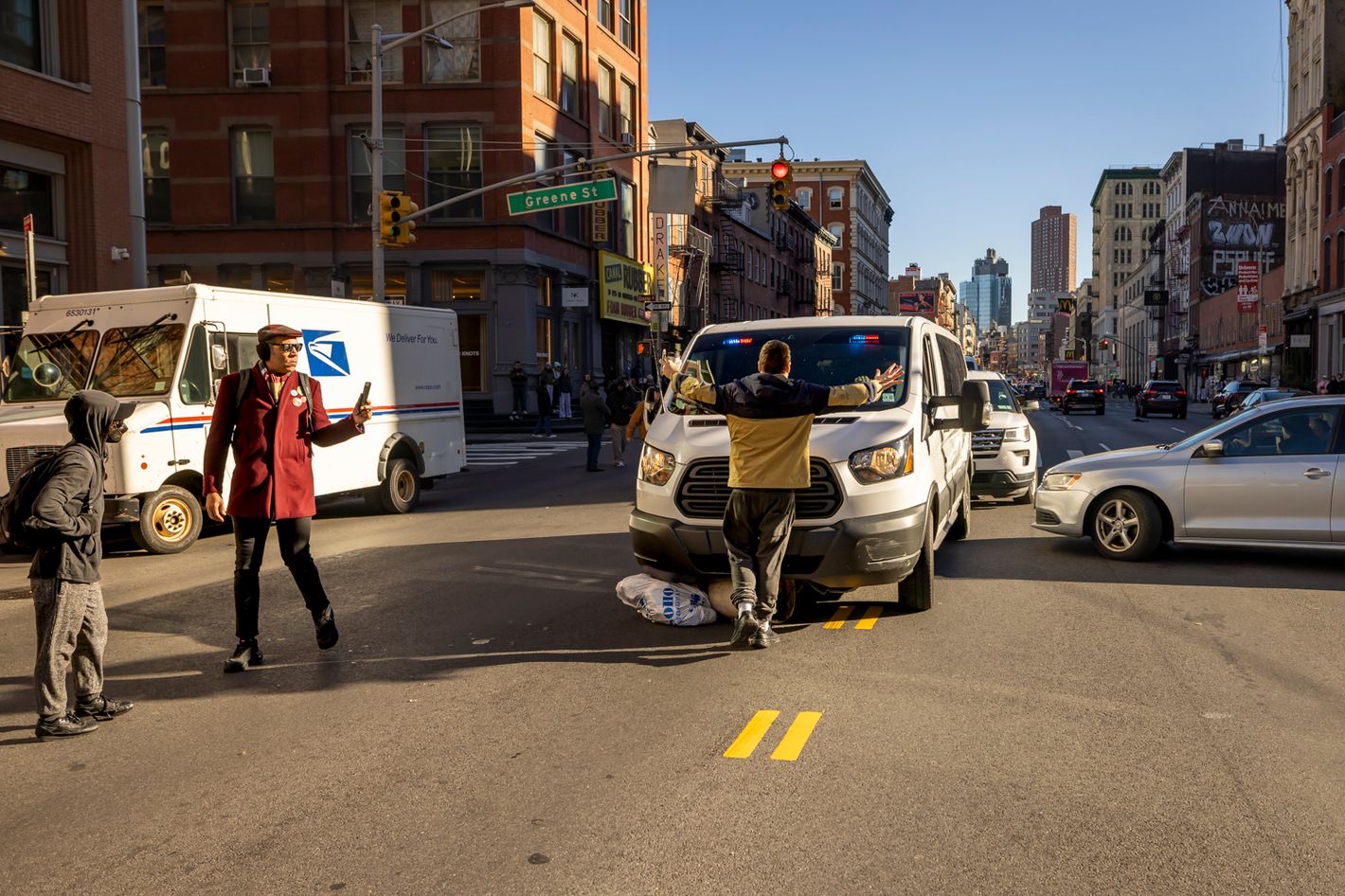 By the time she arrived, about 50 people were blocking the garage’s exit. They locked arms and chanted, “ICE out of New York!” She handed out whistles to passersby, some of whom joined in. “Once people see with their own eyes, Oh, shit it’s happening here in my city, the feeling is a lot different than seeing it on their Instagram Reels or TikTok feed,” she says. Protesters dragged trash cans and wood pallets to put in the federal agents’ path. Others stood in front of government vans, stopping and slowing their progress all the way to Holland Tunnel, about a mile away. Julie DeLaurier, 69, locked eyes with one federal agent and said, “You don’t have to do this.” By the time the NYPD arrived a half-hour later, organizers say the protest had grown to some 200 people. Police eventually cleared a path for ICE to leave, using pepper spray on protesters and arresting more than a dozen people.