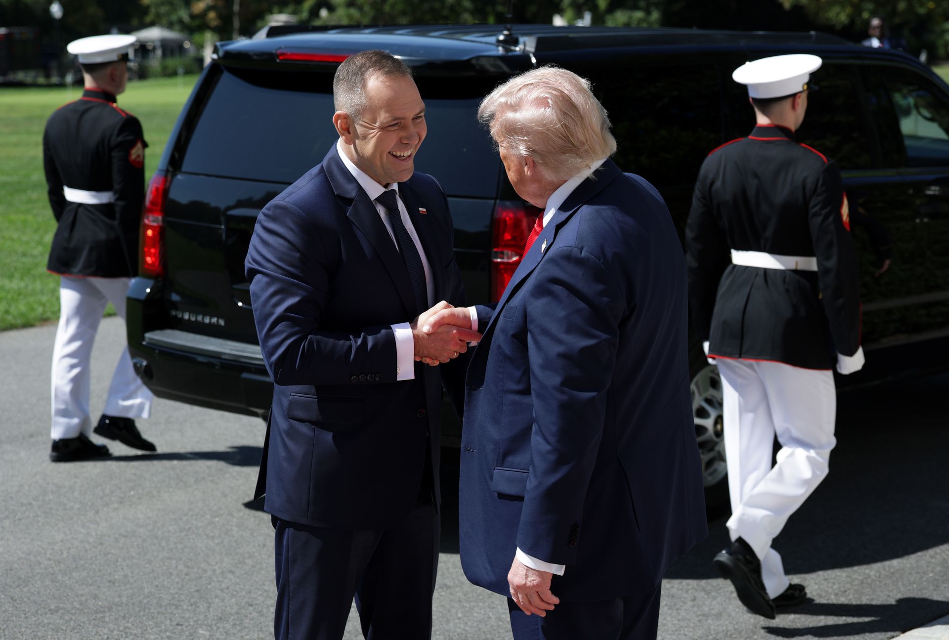 U.S. President Donald Trump ® welcomes Polish President Karol Nawrocki on Sept. 3, 2025, in Washington, DC. (Alex Wong/Getty Images)