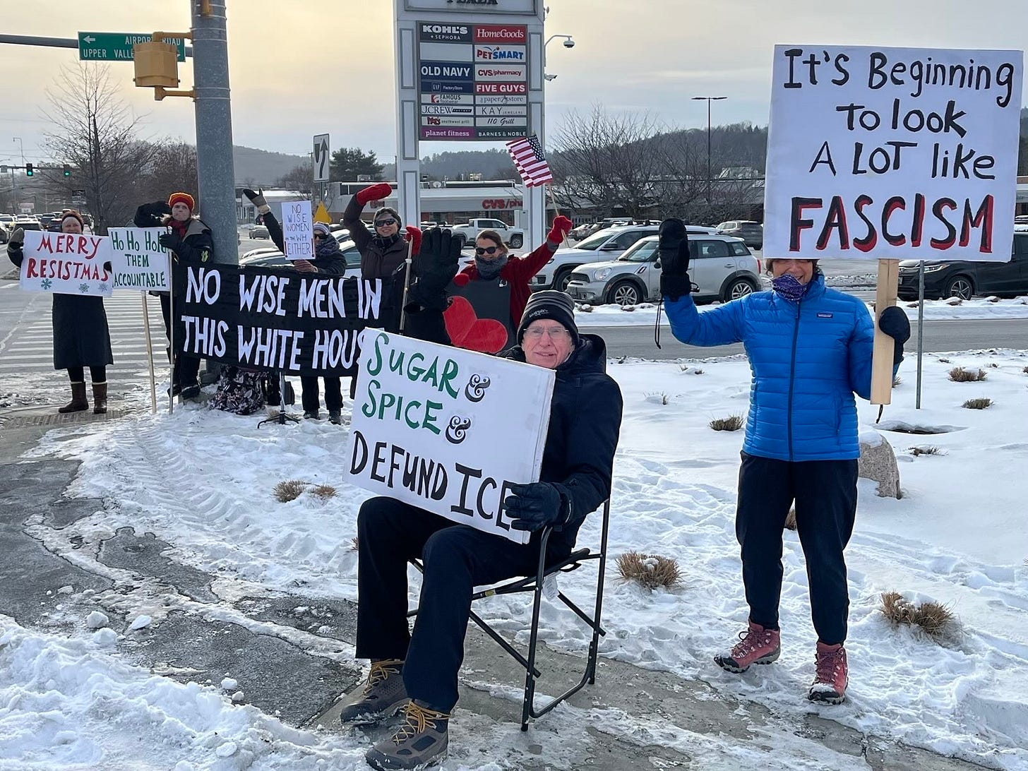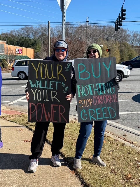 On Black Friday, a small group of Indivisible Gwinnett members held a sign-waving at the corner of a very busy intersection in Snellville, GA’s main shopping area. The response by passing motorists was totally positive. The photo below is of just two of our participants.