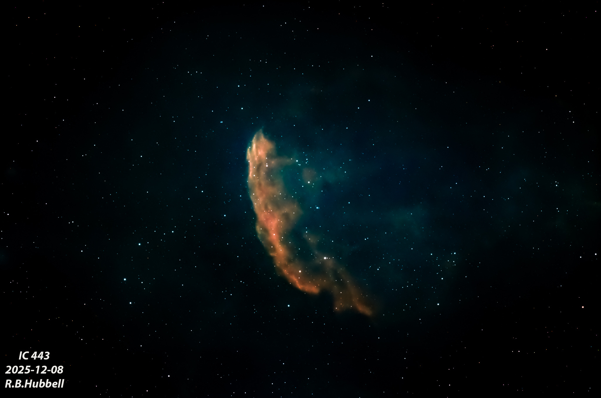 IC 443, also known as the Jellyfish Nebula, is a supernova remnant located 5,000 light-years from Earth. The nebula is significantly larger than the portion shown below, but much of the nebula requires a specialized filter (Oxegyn-III) to capture the full extent of the nebula. The blue traces on the right side of the nebula hint at the gases that are beyond the unaided visual spectrum.