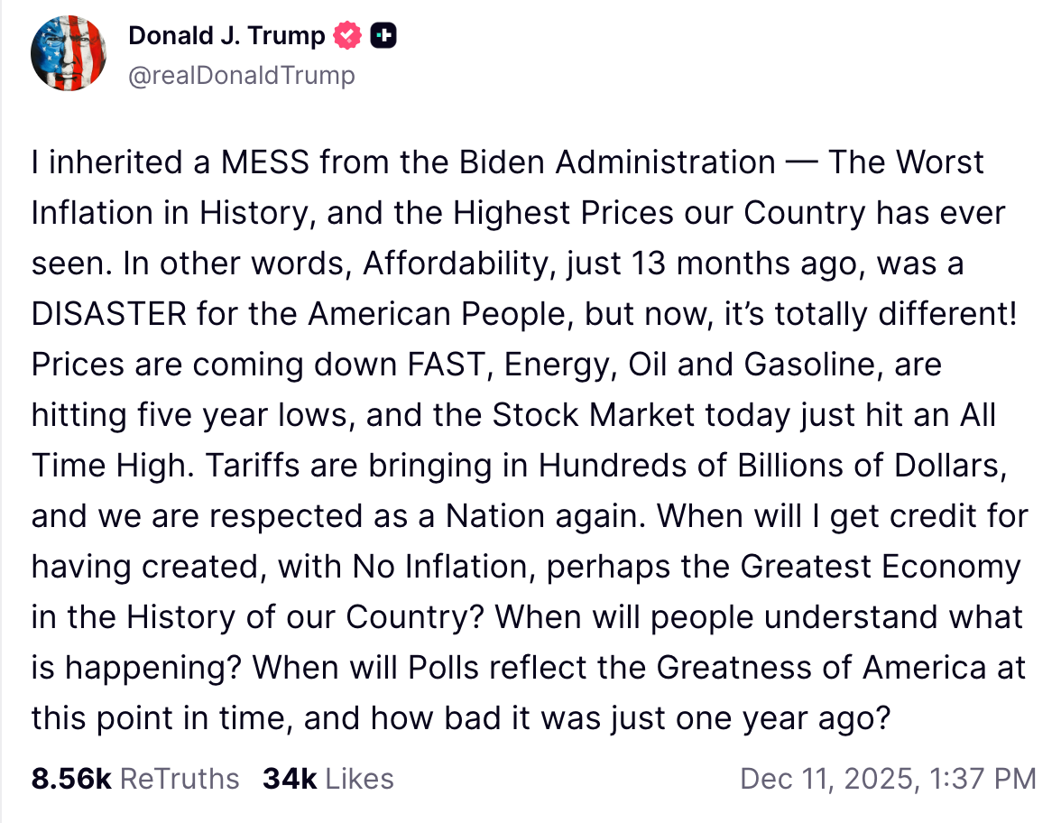 Assuming Trump believes half of what he says, this aggrieved astonishment makes some sense. Throughout the 2024 campaign, he regularly depicted the Biden administration as utterly depraved and consciously evil — a nation-destroying enterprise with not a bit of redeeming value, having wrecked the living paradise Trump was busily building during his first term. The 47th president fully resumed and even accelerated his American-greatness project in 2025 and is already so satisfied with his success that he is devoting a great deal of time to building monuments to himself and demanding global recognition of all he has done. Yet instead of being able to bask in his accomplishments and glory in his plans, he’s being told by the political experts in his orbit that the people aren’t happy. Indeed, even as he claims that in one year the country has gone from Weimar levels of hyperinflation to a dizzying climb in real wages and living standards, he’s being pushed out on the road to exhibit concerns about affordability, a term he has mocked and repeatedly called a hoax.