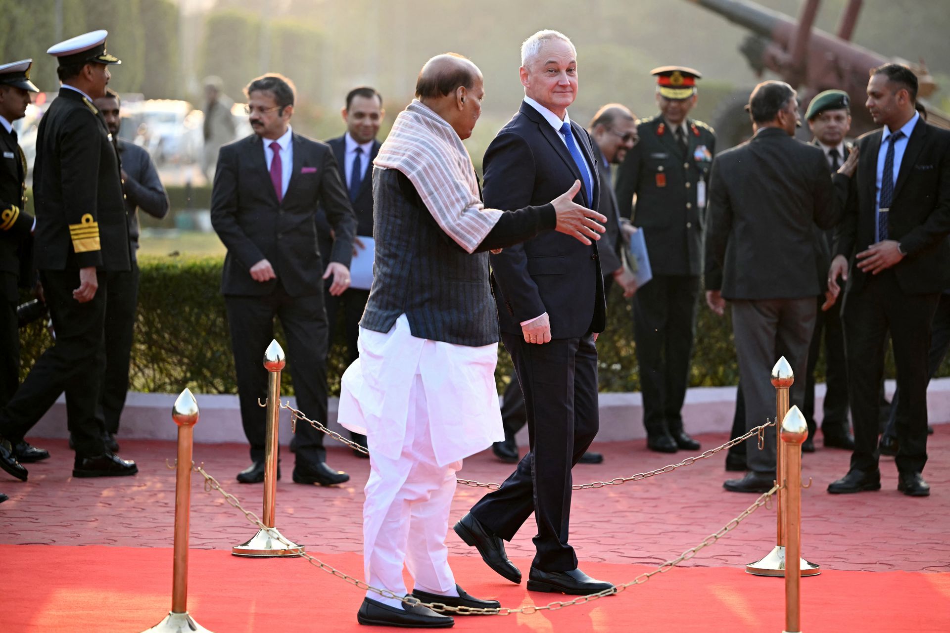 Russian Defence Minister Andrei Belousov (Centre R) and his Indian counterpart Rajnath Singh (Centre L) arrive for a guard of honour ceremony before their meeting, in New Delhi, India, on Dec. 4, 2025. (Sajjad Hussain / AFP via Getty Images)