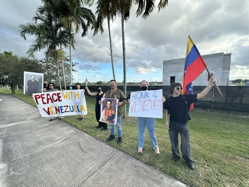 Doral, FL – On Wednesday, December 10, activists stood across from United States Southern Command (SOUTHCOM) protesting the escalation of attacks against Venezuela. About a dozen activists came to the protest at 2:30 p.m. to demand that the airstrikes stop, the warships are brought back home, and that the government restore Temporary Protected Status protections for Venezuelans.