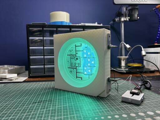 The build is simply a recreation of the standard 5mm x 5mm WS2812B, only scaled up to 150 mm x 150 mm. It uses a WS2811 chip inside to make it behave in the same way from a logical perspective, and this controller is hooked up to nine standard RGB LEDs switched with MOSFETs to ensure they can deliver the requisite light output. The components are all assembled on a white PCB in much the same layout as the tiny parts of a WS2812B, which is then installed inside a 3D-printed housing made in white PLA. Large metal terminals were added to the housing, just like a WS2812B, and the lens was then created using a large dose of clear epoxy.
