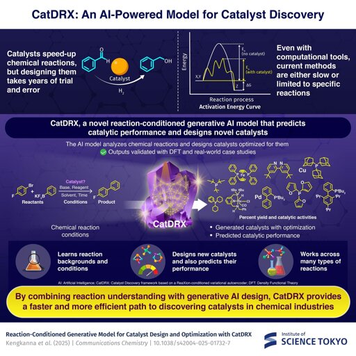 CatDRX is a generative AI framework developed at Institute of Science Tokyo, which enables the design of new chemical catalysts based on the specific chemical reactions in which they are used. The model learns from large reaction datasets and predicts how well a catalyst will perform, while also proposing new catalyst structures. Validated across various reaction types, CatDRX offers a promising strategy to accelerate catalyst discovery for a wide range of chemical and industrial processes.