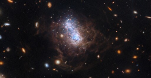 Day 17 of the 2025 Space Telescope Advent Calendar: Distant Starbursts. Last year, the James Webb Space Telescope made this observation of a dwarf irregular galaxy named I Zwicky 18, some 59 million light-years away from Earth. At the heart of the galaxy are two major star-forming regions surrounded by clouds of gas that have been sculpted by the stellar winds of the hot, young stars.