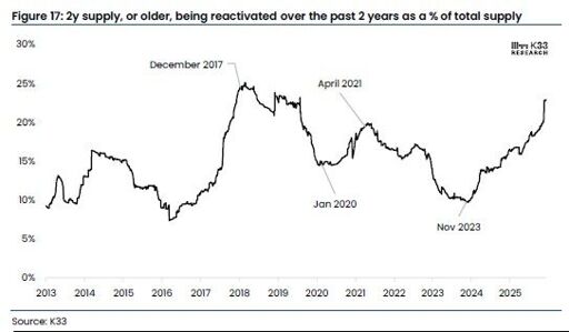 More than two months after the token hit a record high above $126,000, Bitcoin has fallen nearly 30% and is struggling to find support. One reason: its long-time holders haven’t stopped selling. According to a report from K33 Research, the amount of Bitcoin that had remained unmoved for at least two years has declined by 1.6 million coins since early 2023, roughly $140 billion worth.