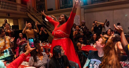 Qween Jean, the organizer and founder of Black Trans Liberation Kitchen and TransGiving, addresses guests: “It’s such a magical night as we come together for fellowship to heal, to feed, and to nourish each and every person here.”