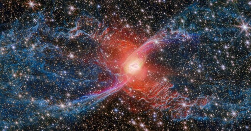 Day 18 of the 2025 Space Telescope Advent Calendar: A Spider Among the Stars. About 5,000 light-years away, the Red Spider Nebula is the result of the spectacular final act of a dying star. The James Webb Space Telescope recently imaged this planetary nebula, showing the glowing outer layers of the star—which have been cast off for thousands of years, blasted into space in all directions—against a backdrop of countless other stars in our own galaxy.