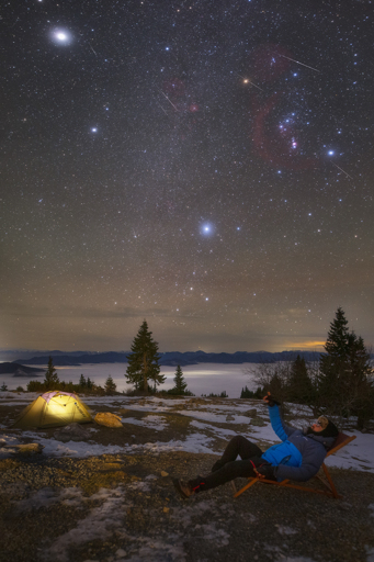 Ondrej Králik Geminid meteors streak above this photographer’s campsite (in freezing temperatures) in Slovakia’s Malá Fatra National Park. The scene was captured in a 15-second exposure at f/2 and ISO 4000 with an astromodified Canon DSLR and 24mm lens; meteors were imaged over a one-hour period to create a composite.