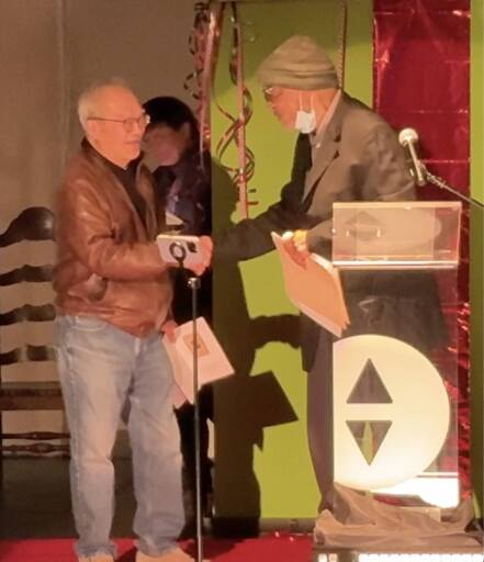 Ishmael Reed presenting William Gee Wong with the American Book Award for memoir. Photo: Tennessee Reed.