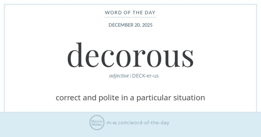 arrow-up10arrow-down1external-linkThe Merriam-Webster word of the day for December 20 is decourous, as in, "We went to church and heard decorous sing 'Hark the Herald Angels Sing'"www.merriam-webster.comrssMB to FarkEnglish · 4 hours agomessage-square0linkfedilinkfile-text