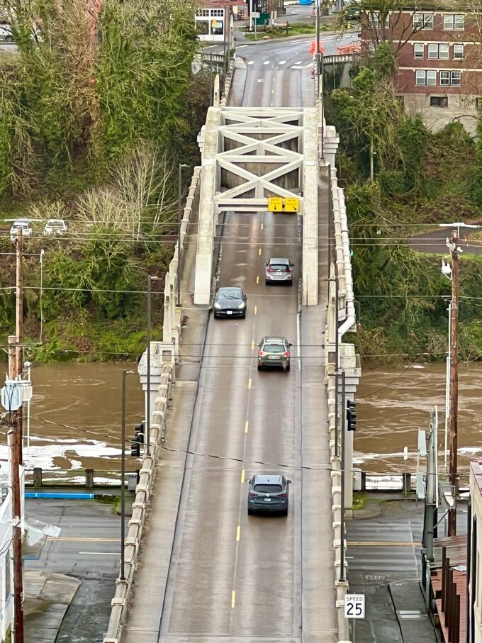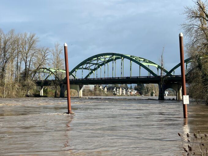 Arch Bridge over the flooded Willamette, looking toward West Linn.