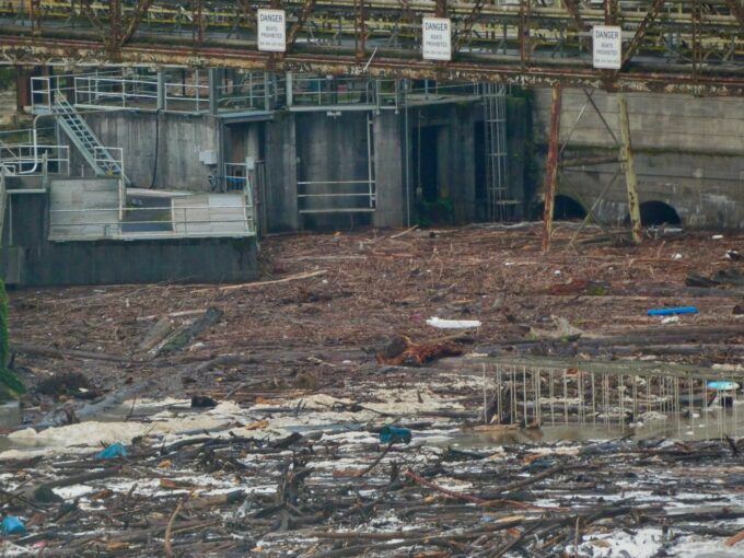 Flood debris at the old Willamette Falls hydro plant, first in the Pacific Northwest.