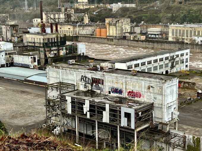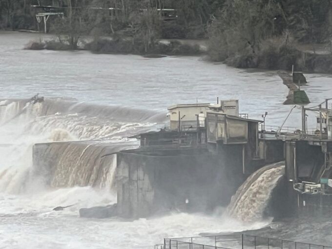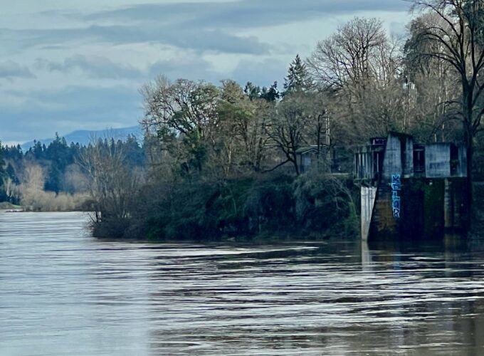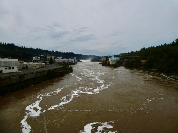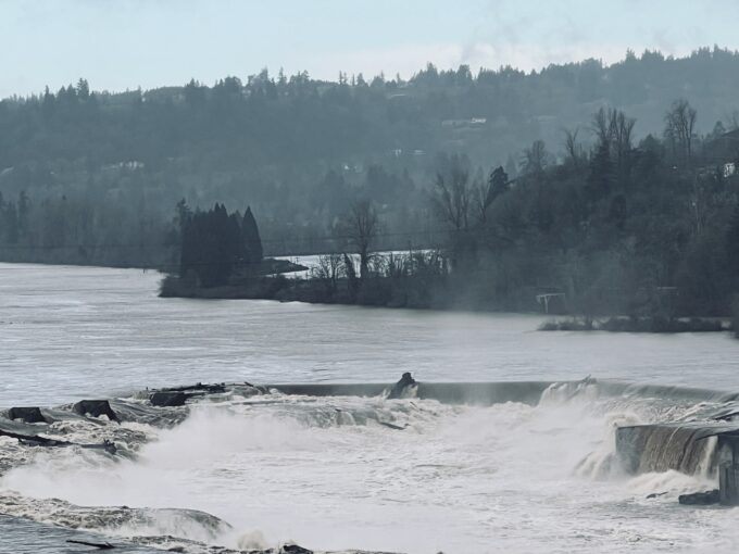 Willamette rising up the riverwall at the old Oregon City and West Linn mills.