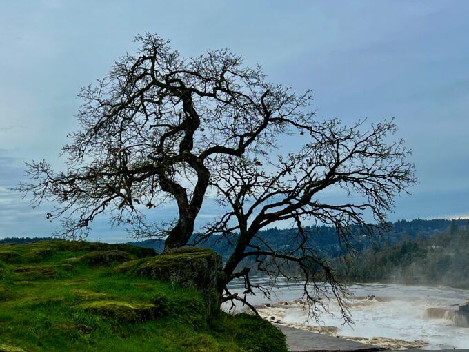 Oregon live oak on the cliff above flooded Willamette Falls, near the site where five Cayuse men were wrongly hanged in 1850.