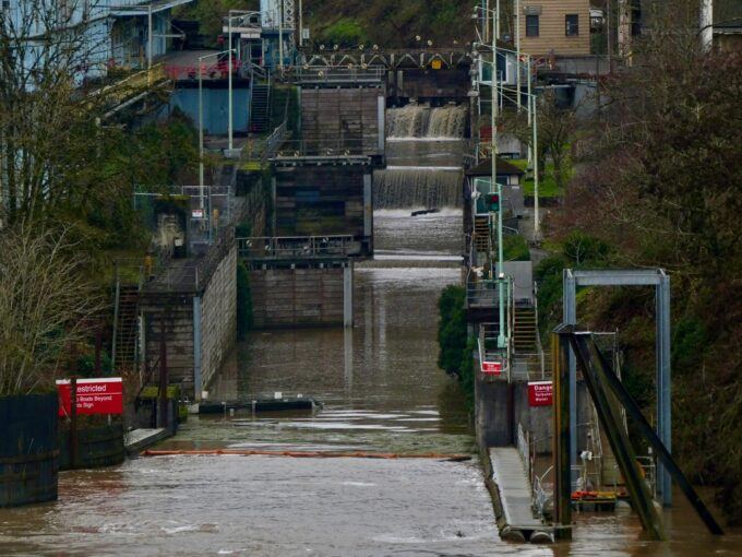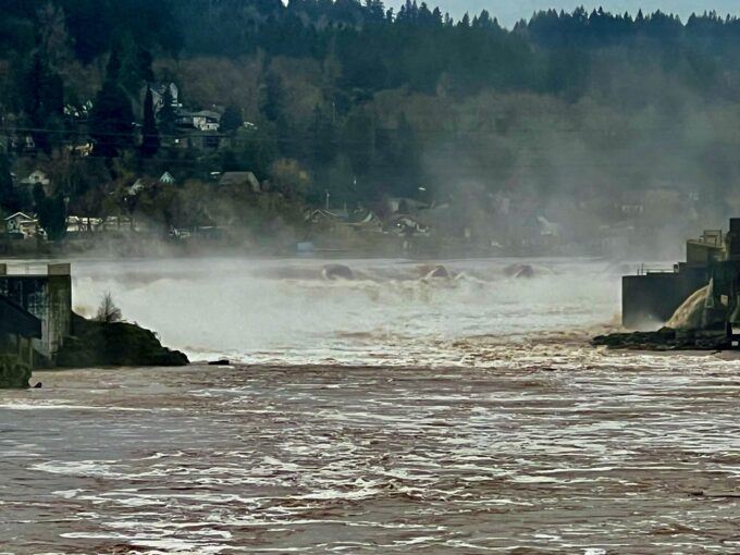 Willamette Falls, second second-largest falls by volume in the US, nearly inundated.