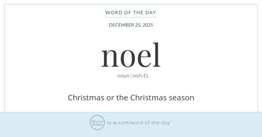 arrow-up13arrow-down1external-linkThe Merriam-Webster word of the day for December 25 is Noel, as in "Christmas is spelled with Noel"www.merriam-webster.comrssMB to FarkEnglish · 1 day agomessage-square1linkfedilinkfile-text