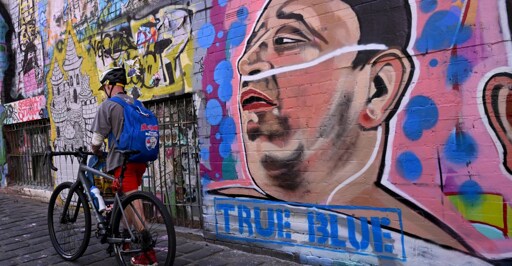 A man passes a mural by Jarrod Grech of Ahmed al Ahmed, the hero who was filmed tackling and disarming one of the attackers in the Bondi Beach mass shooting, in a Melbourne laneway on December 22, 2025. | William West/AFP via Getty Images