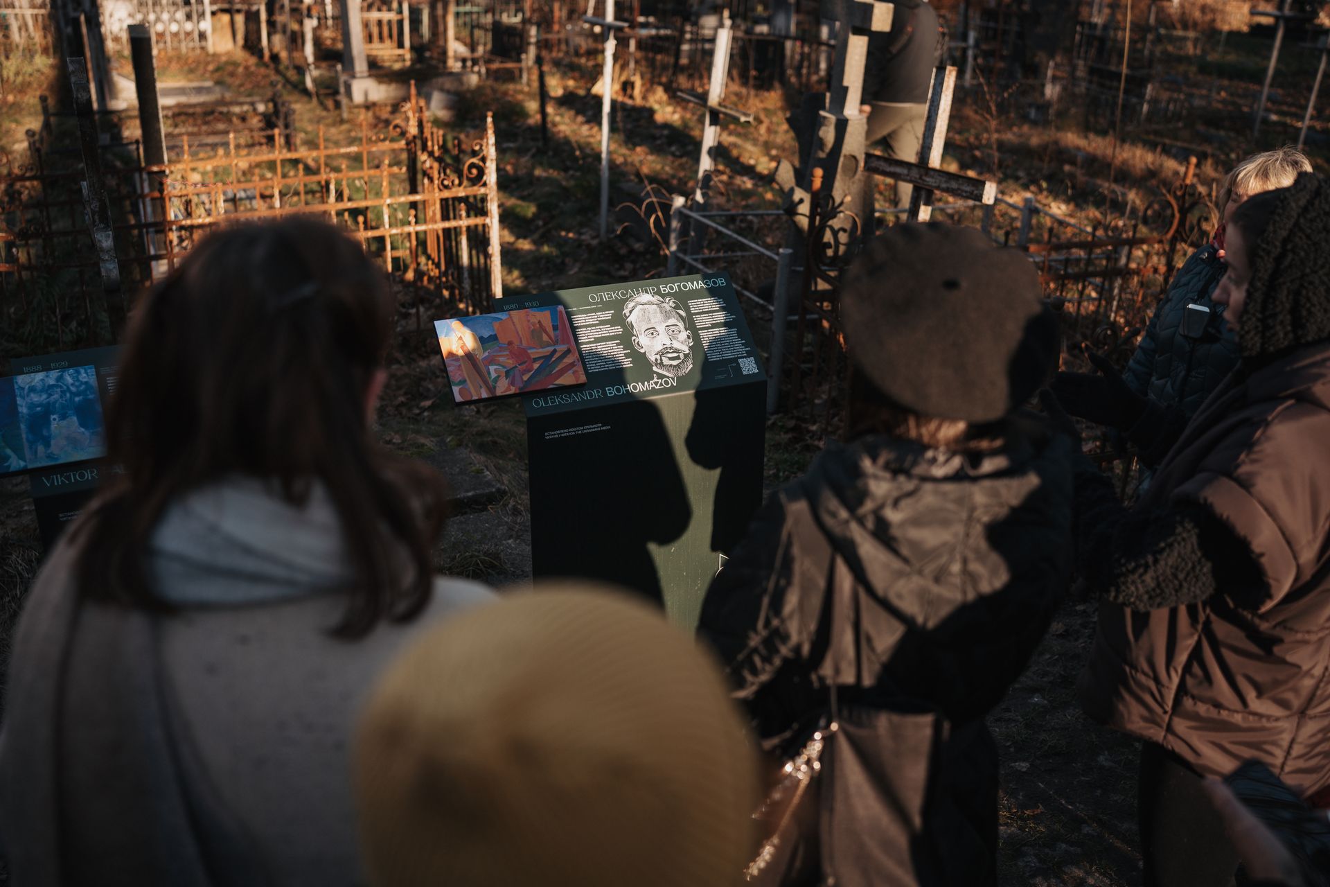 There are around 40 artists buried at the cemetery in total. However, “The Invisible Gallery” focuses specifically on artists Oleksandr Bohomazov, Mykola Murashko, Viktor Palmov, Fedir Krychevskyi, Oleksandr Murashko, Volodymyr Orlovskyi, Serhii Sviatoslavskyi, and Mykola Pymonenko.
