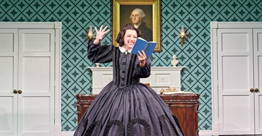 This is the energy that Escola has brought to Oh, Mary! Todd Lincoln, under her prim crinoline, is wearing red-and-white-striped bloomers, which is very panto. And just like a panto, the staging is deliberately lo-fi: two static sets, a wheeled-on theater box, and a bit of front-of-curtain business. On Broadway, The New York Times described it as having “the cheesy naturalism of community theater.”