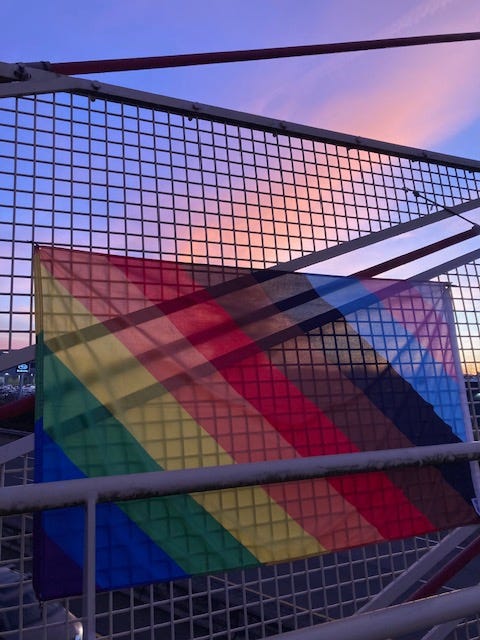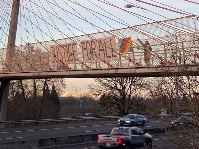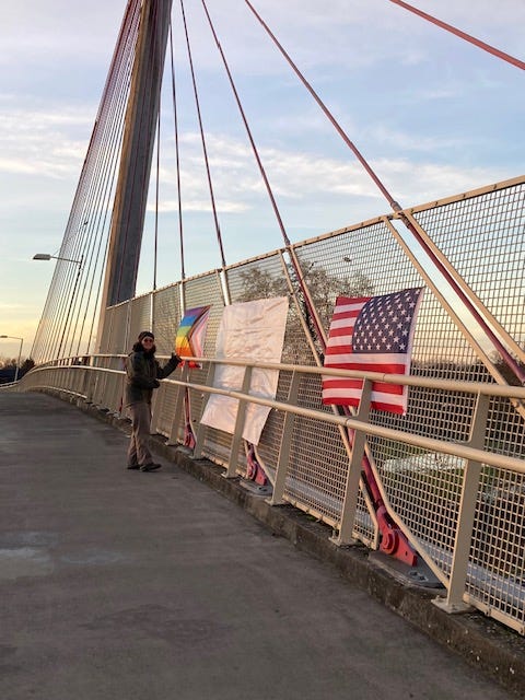 We added FOR ALL to our JUSTICE message on the Delta bike bridge in Eugene. What’s next, you ask…LIBERTY AND? In the other direction, it said “LOVE” in red duct tape, which went nicely with the US flag! Many honks and waves. Working on a new sign supporting immigrants, and on recruiting more participants!