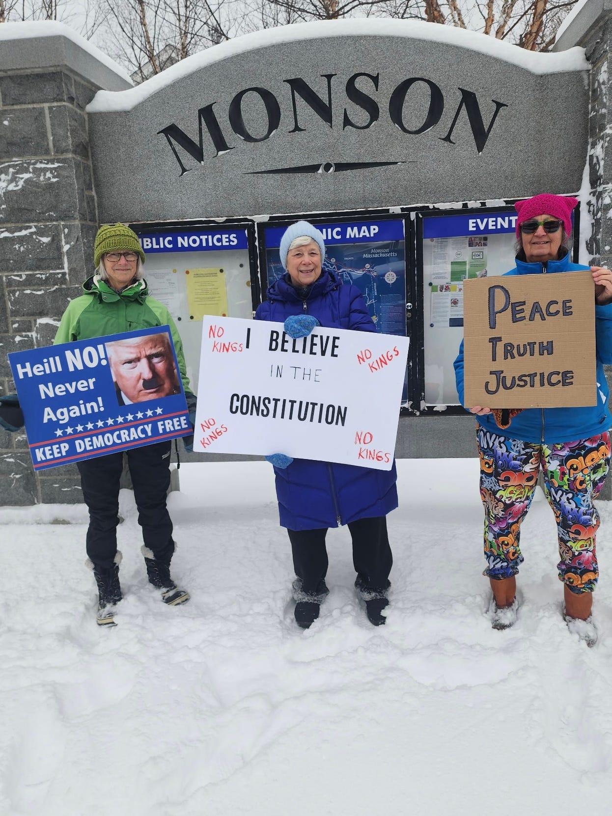 We have a group of democracy supporters in Monson, MA (split 50 -50 between Democrats and Republicans but that went narrowly for Trump in 2024) that show up every Saturday morning, and have been doing so since the beginning of April. Usually, we have between 15 and 20 people and we receive a lot of honks and support. Last week, we had only three people who braved the18 18-degree temperature and the snow from Friday night. Some in the group suggested stopping until spring, but we decided to keep going to support for democracy with however many people show up!