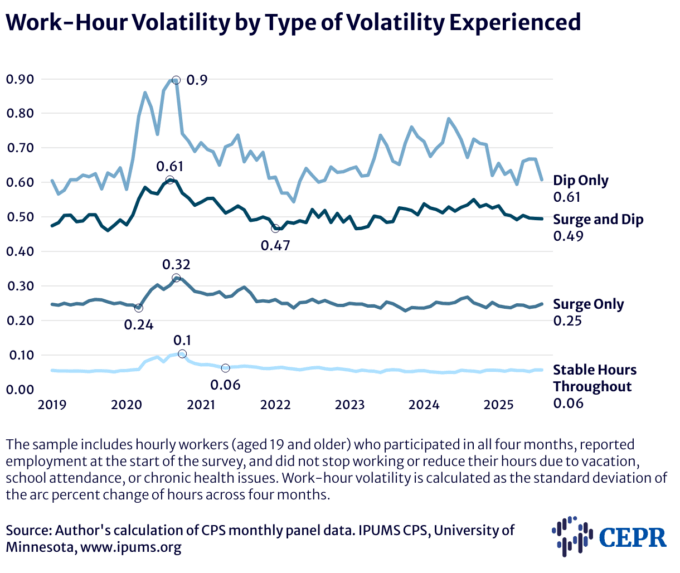 Consistent with prior research, I calculated the hours instability index using the standard deviation of arc percentage change. This index measures the extent of fluctuations in a worker’s hours over a four-month period. A higher index value reflects greater volatility. Workers are classified into four mutually exclusive categories based on their experience: (1) hours spike only, defined as at least a 20 percent increase in month-to-month hours; (2) hours dip only, defined as at least a 20 percent decrease from one month to the next; (3) both hours spike and dip; and (4) stable hours throughout.
