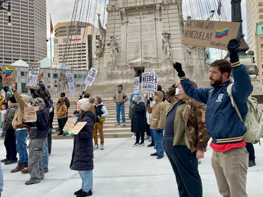 Indianapolis, IN – About 60 people gathered Saturday afternoon, January 3, at Monument Circle in downtown Indianapolis to protest the U.S. military attack on Venezuela and the kidnapping of Venezuelan President Nicolás Maduro.