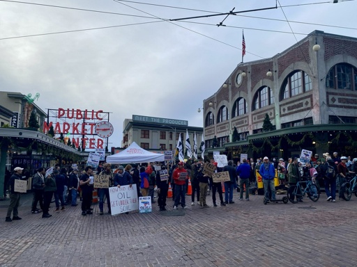 Seattle, WA – Approximately 120 protesters rallied at Pike Place Market in downtown Seattle on January 3 to condemn the U.S. military’s illegal bombings of Venezuela and the kidnapping of President Nicolás Maduro.