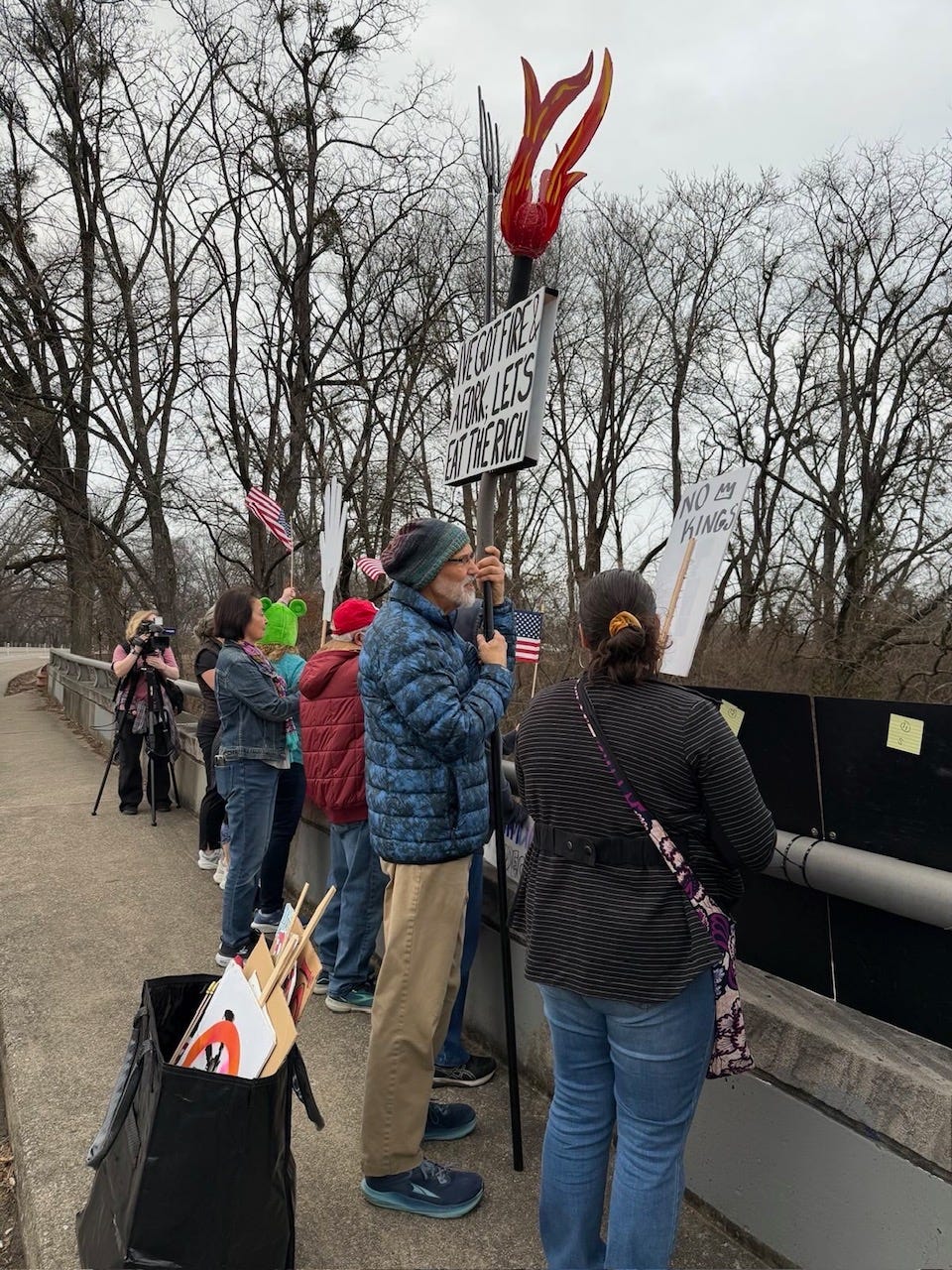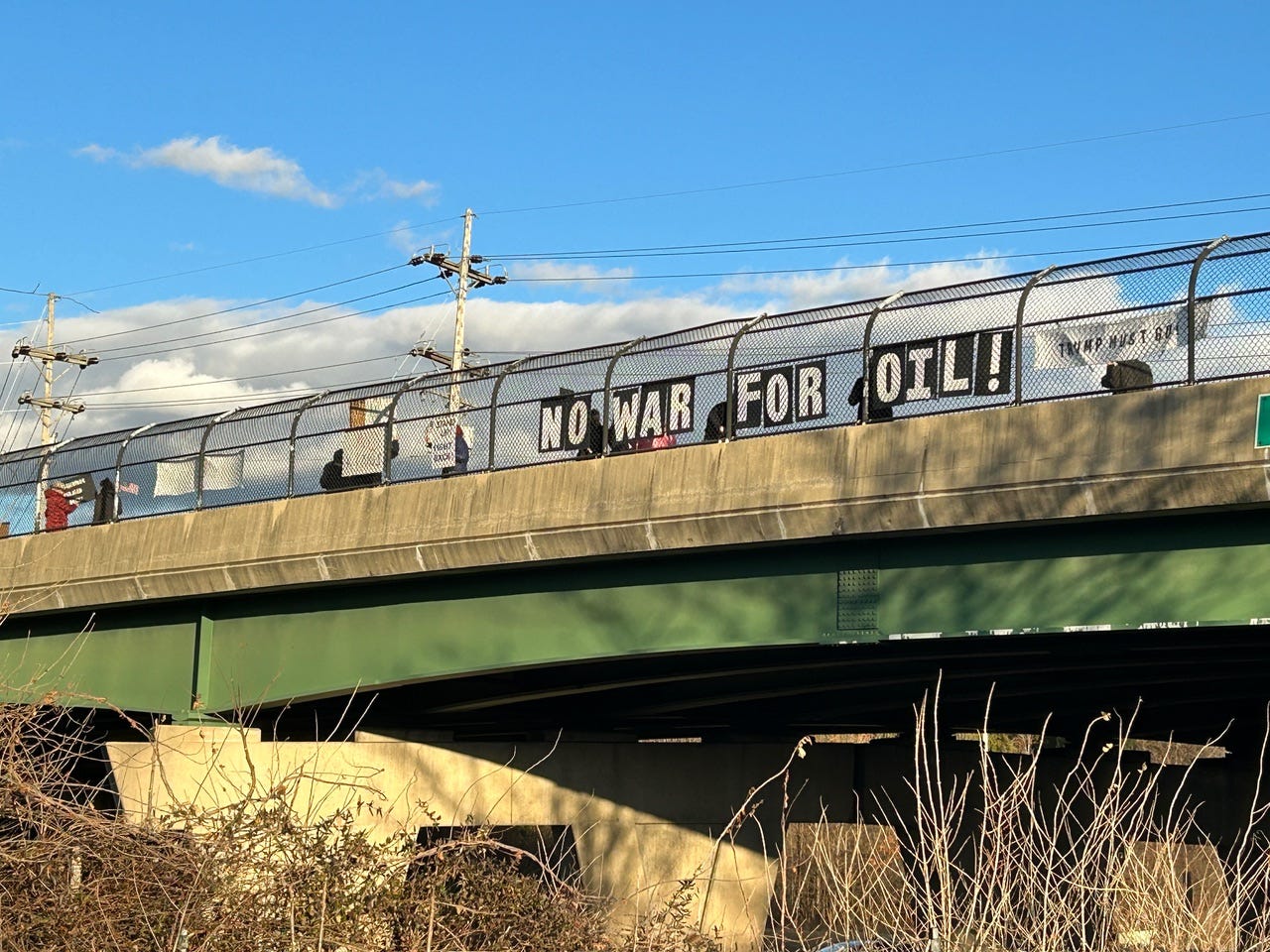Ultimately, 45 people participated in this pop-up protest of the Venezuelan invasion, organized by local Indivisible, on the I-270 overpass just outside Frederick, MD. We got a lot of honks and waves from passing cars.