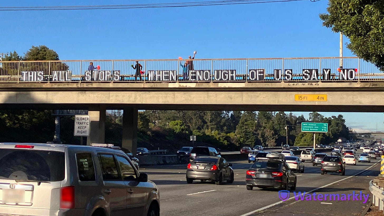 On Wednesday morning, reader Jenny B. sent the photo (below) showing the message of a “bridge brigade” in Oakland, CA, which used the title of yesterday’s newsletter. As I told Jenny, it brought tears to my eyes: