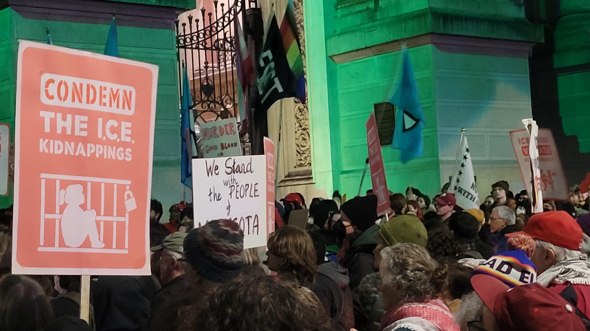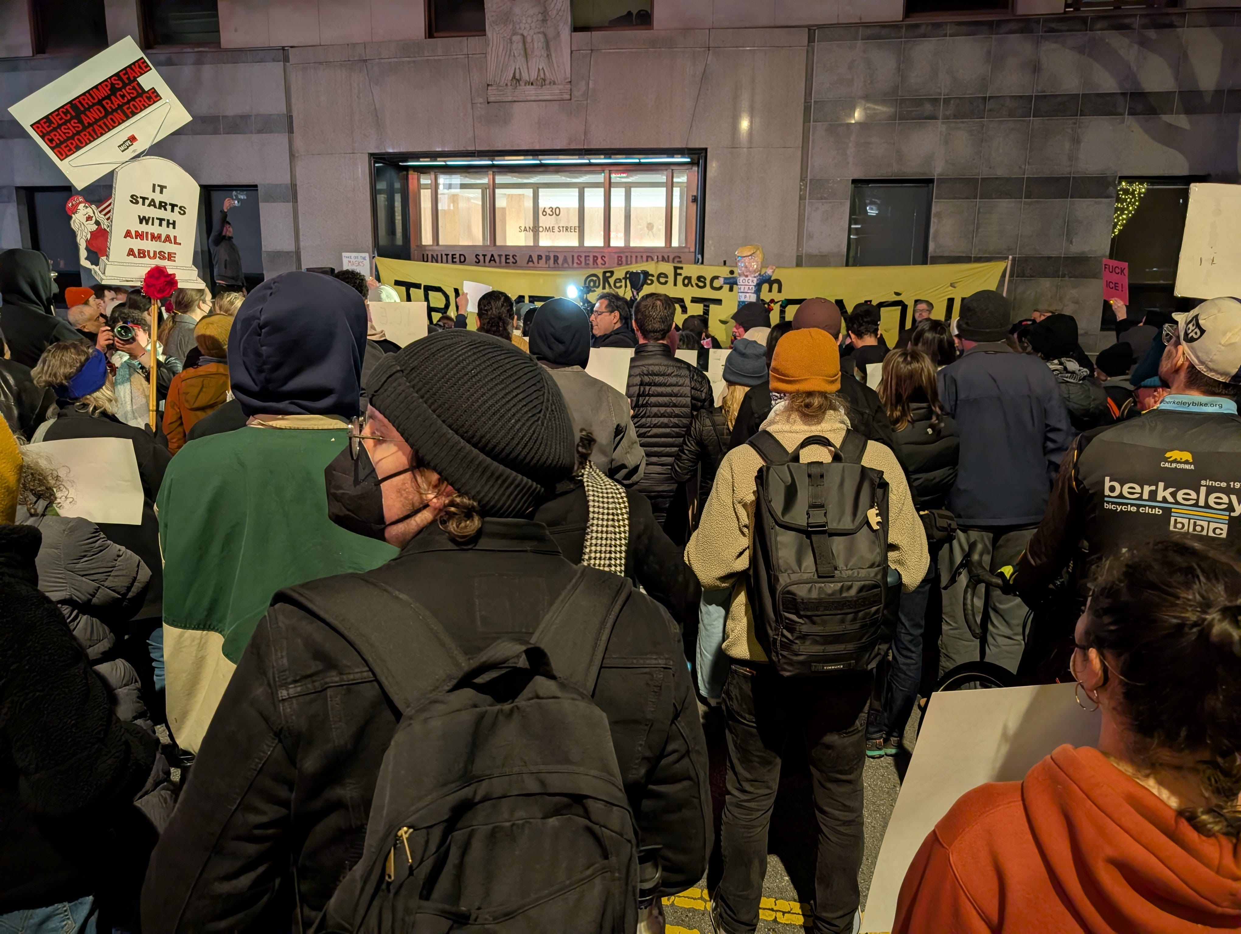 Indivisible SF called for a protest in front of the immigration court yesterday over the MN murder, and on very short notice, 200-300 people peacefully gathered on Sansome St, followed by a peaceful march down Market St to Civic Center.