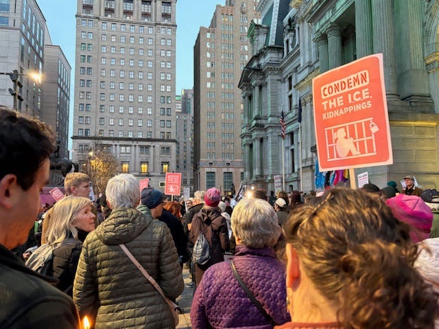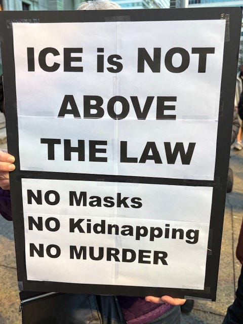 The friend I went with estimated the crowd size in the low thousands (like around 4000). . . .I was interviewed by one of Boston’s two NPR stations (WGBH) about my motivation for being there. I was very motivated by the murder of Renee Nicole Goode. I also told the interviewer that I read your newsletter, and that one of the things that you’ve told us is that the demonstrations are very important for setting an example of resistance . . . .