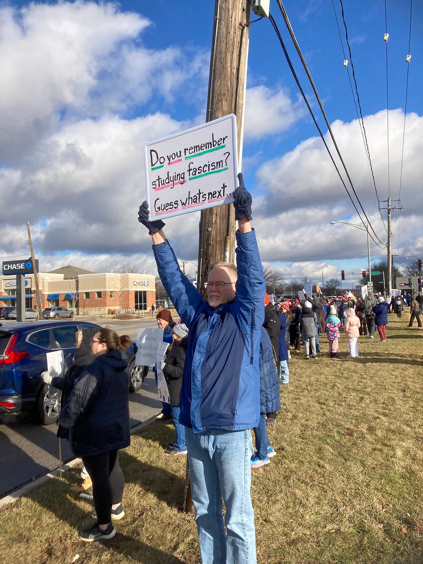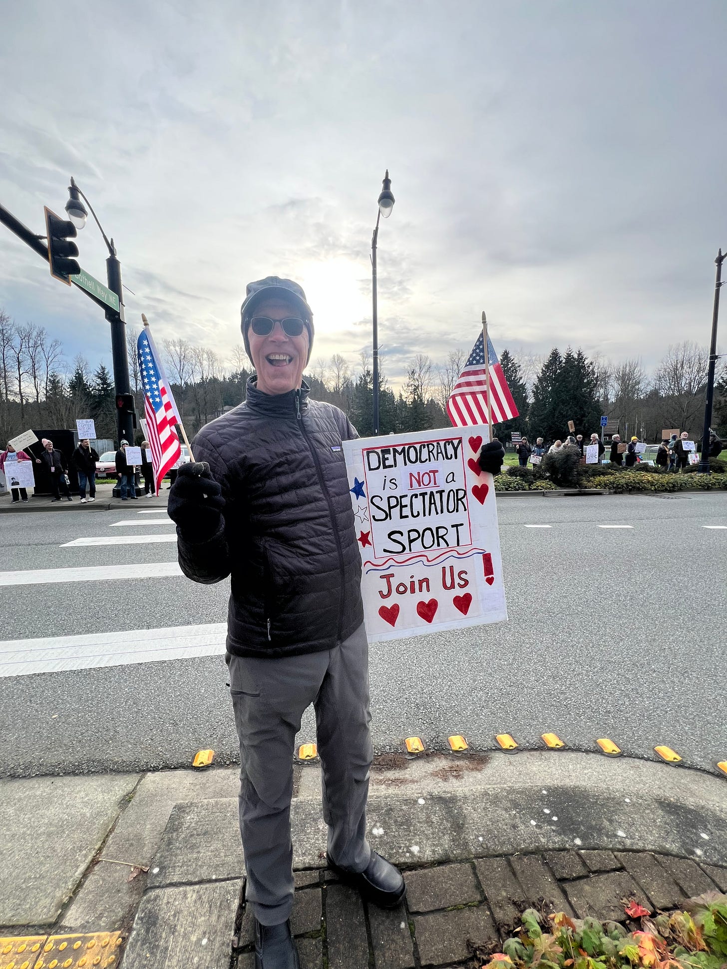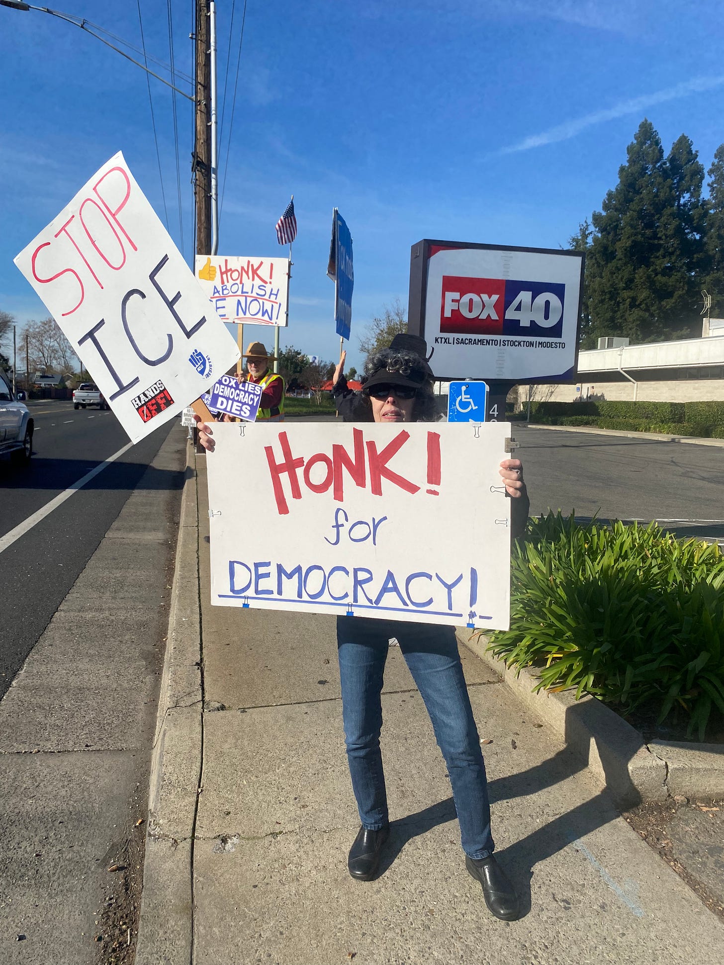 Our weekly protest, which usually has about 20-25 dedicated participants, ballooned to 200 today! See attached photos. It was wall to wall honks and waves.