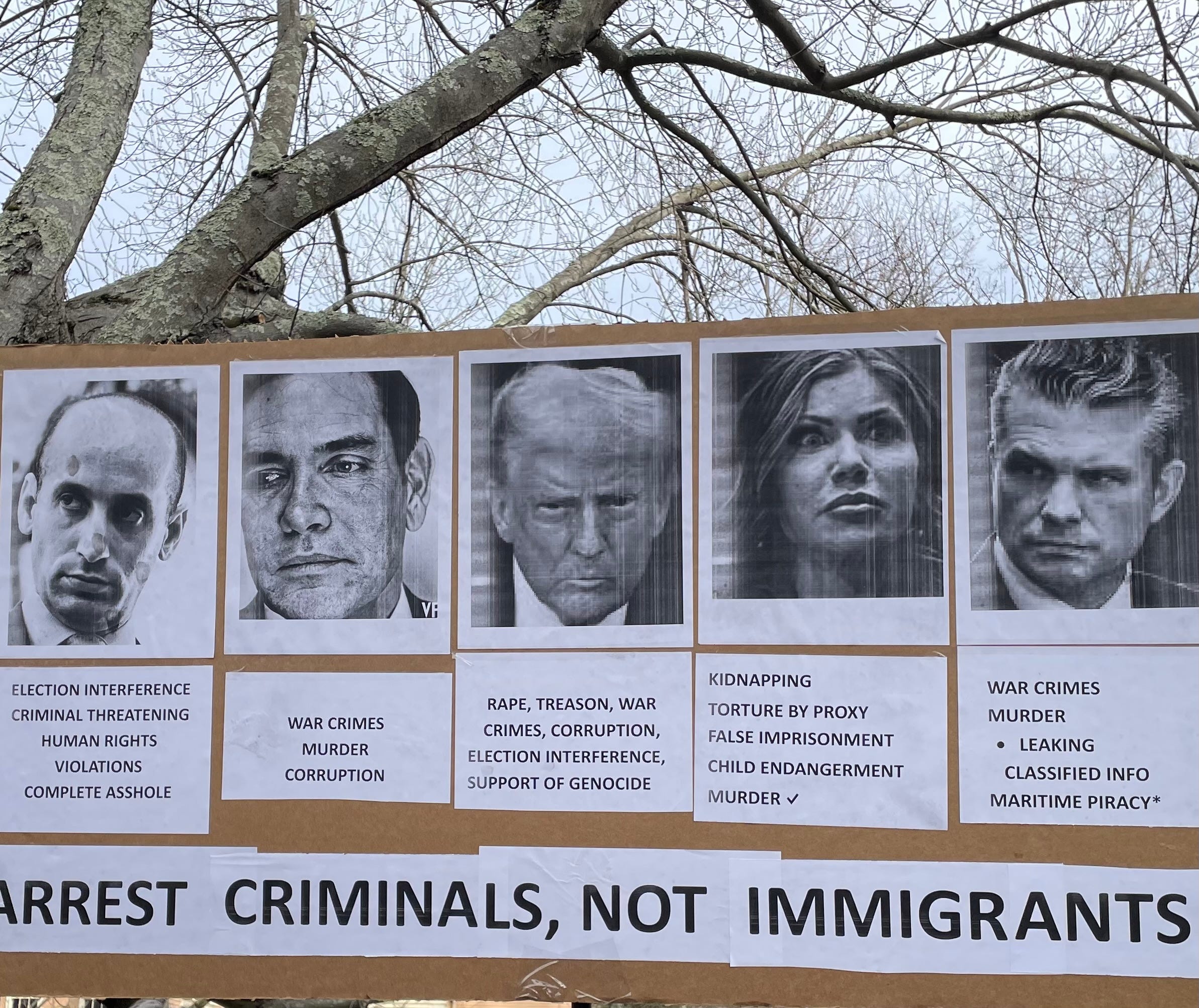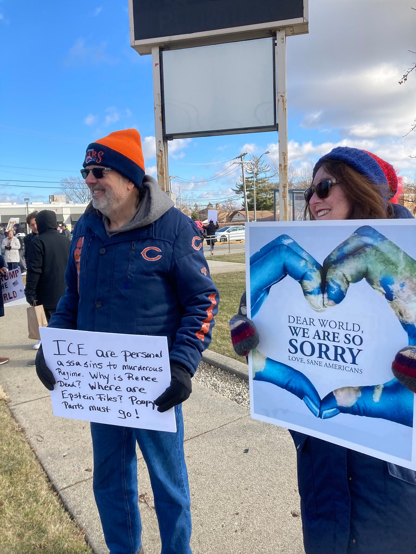 This afternoon, about 160 people gathered along a busy street in Des Plaines, IL (suburb of Chicago). This was one of several ICE OUT events planned in the Chicago area this weekend. Most of them are taking place on Sunday. Attached are photos of signs that caught my attention.