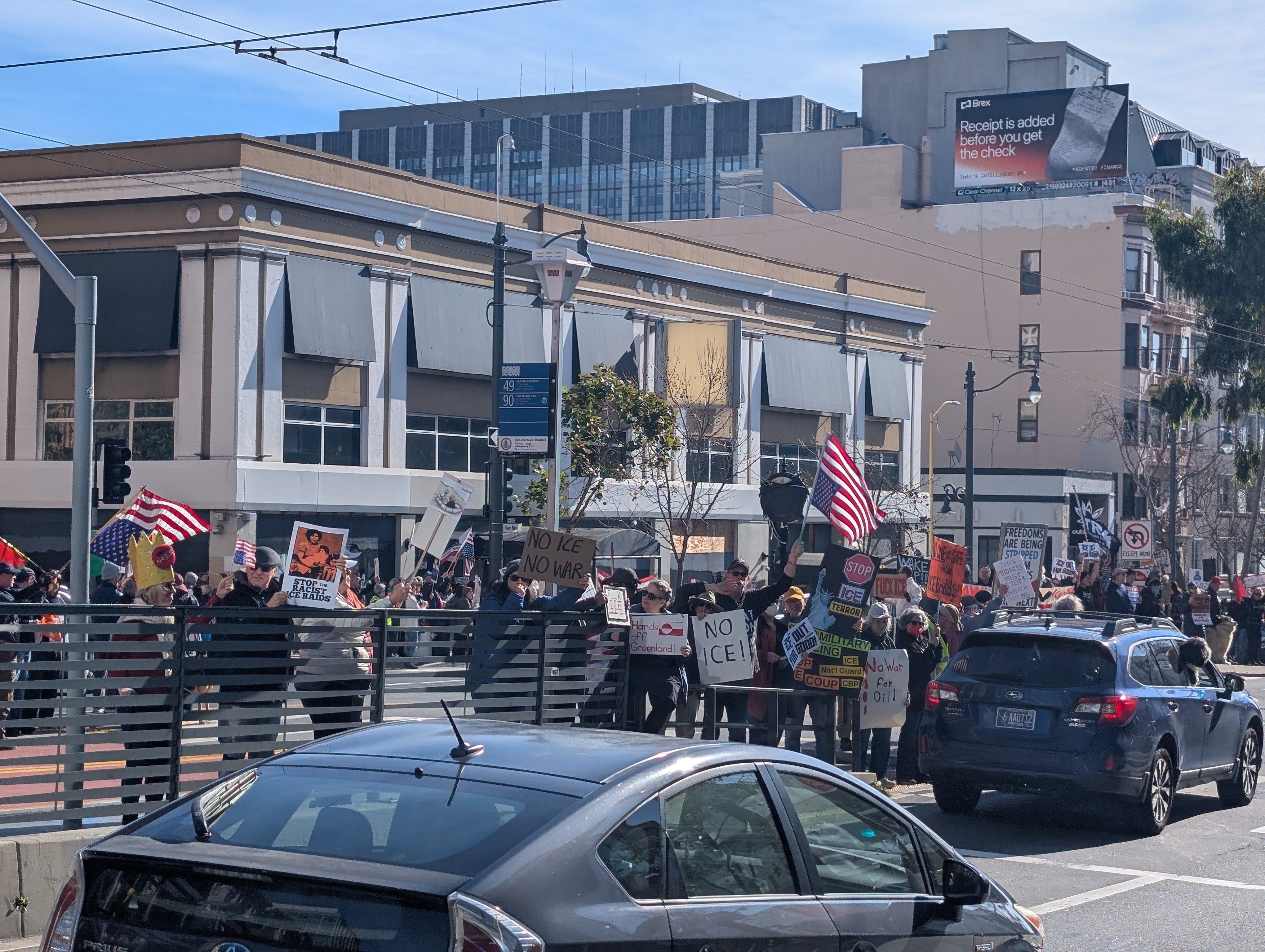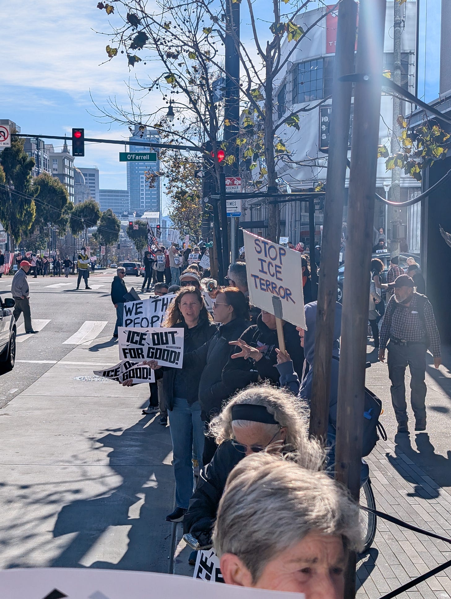 SF at Van Ness and O’Farrell. Several hundred peaceful protestors organized by Indivisible. Hundred of cars and trucks honking in solidarity.