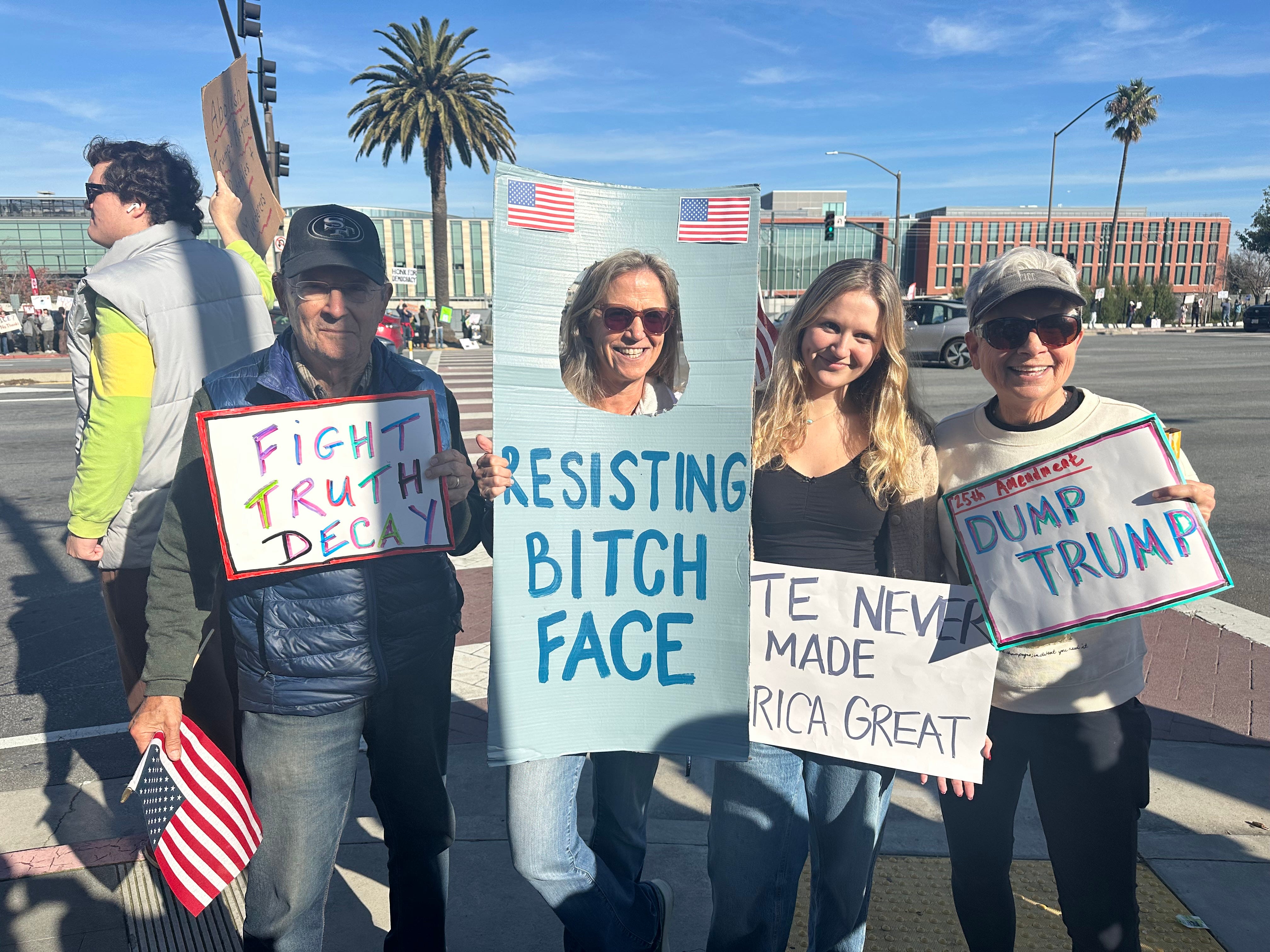 Today’s protest in San Mateo. I estimate an enthusiastic crowd of around 200. There were protests at several Peninsula cities.