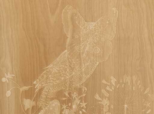Detail of “Waking Dreams 3 (Owl Moth)” (2025), wood engraving, 48 x 25 inches