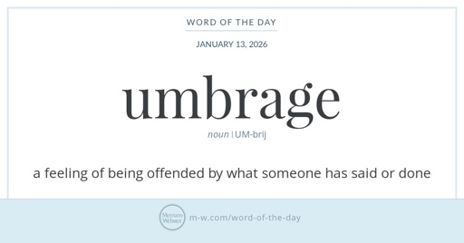 arrow-up13arrow-down1external-linkThe Merriam-Webster word of the day for January 13 is umbrage, as in "The crayon thief left me taking raw umbrage"www.merriam-webster.comrssMB to FarkEnglish · 2 days agomessage-square0linkfedilinkfile-text
