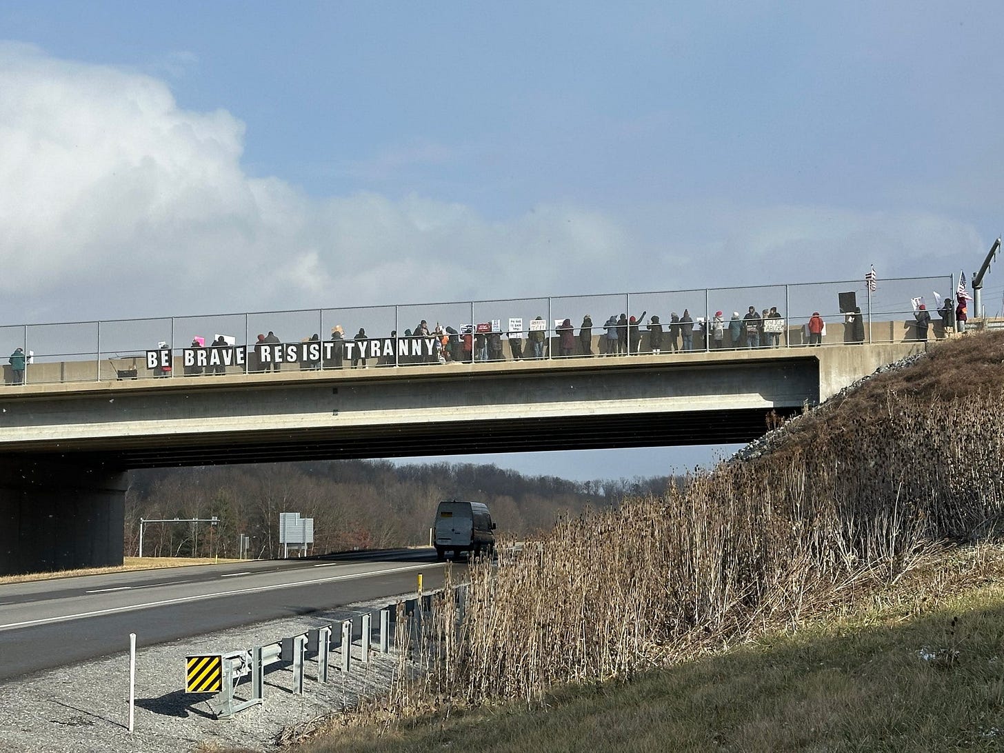 State College, Pa.,the state that sent the second largest contingent to the January 6 th insurrection. I joined this overpass group yesterday. We had many horn honks and thumbs up but a significantly large number of middle fingers, many hoisted by women leaning out of the passenger windows of vehicles driven by “their men,” and with both hands! It’s good to see the posting of the photos that you’ve done, as it helps grasp the overall effort that is being made. Thank you, as always,