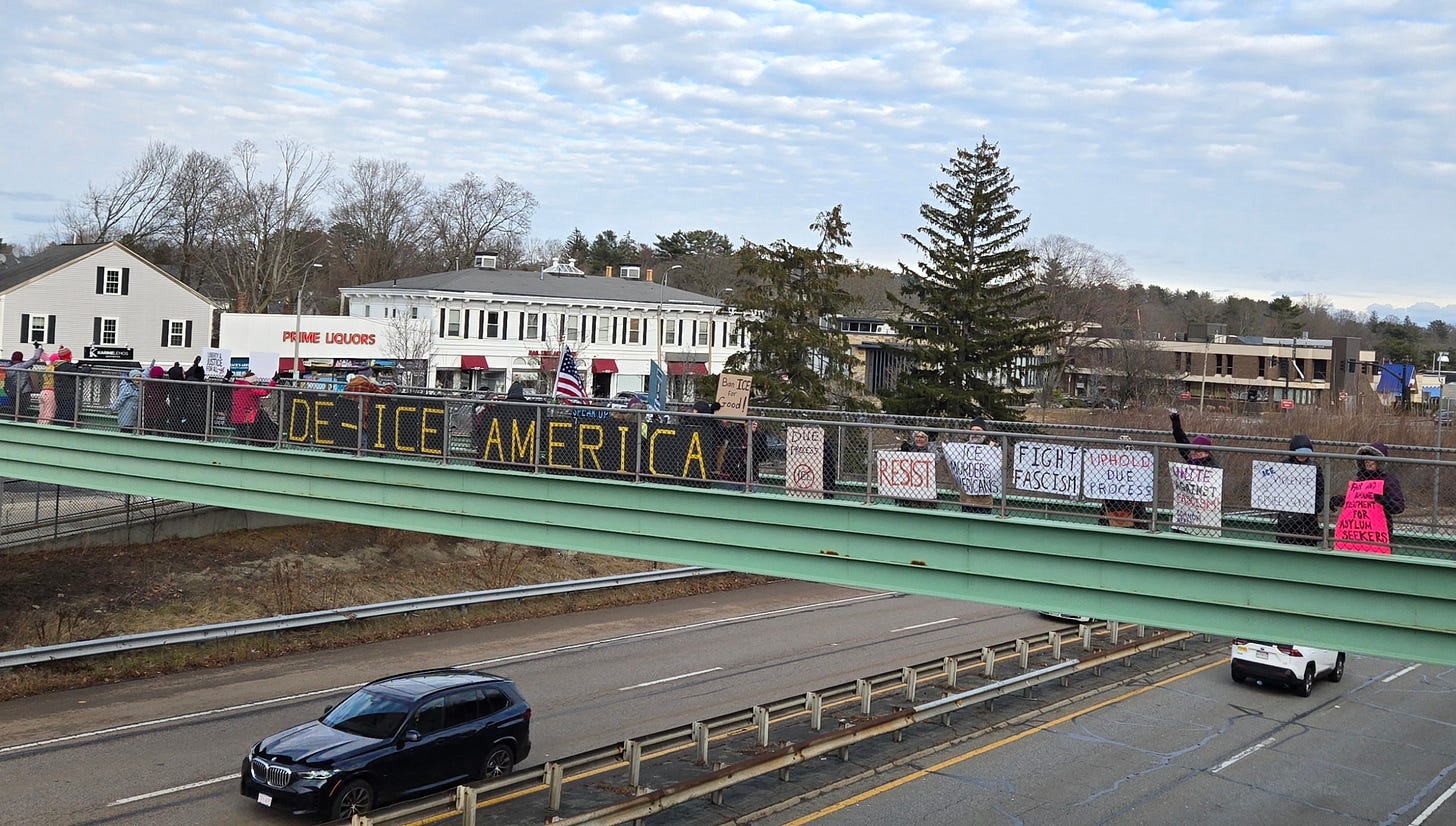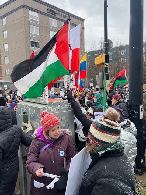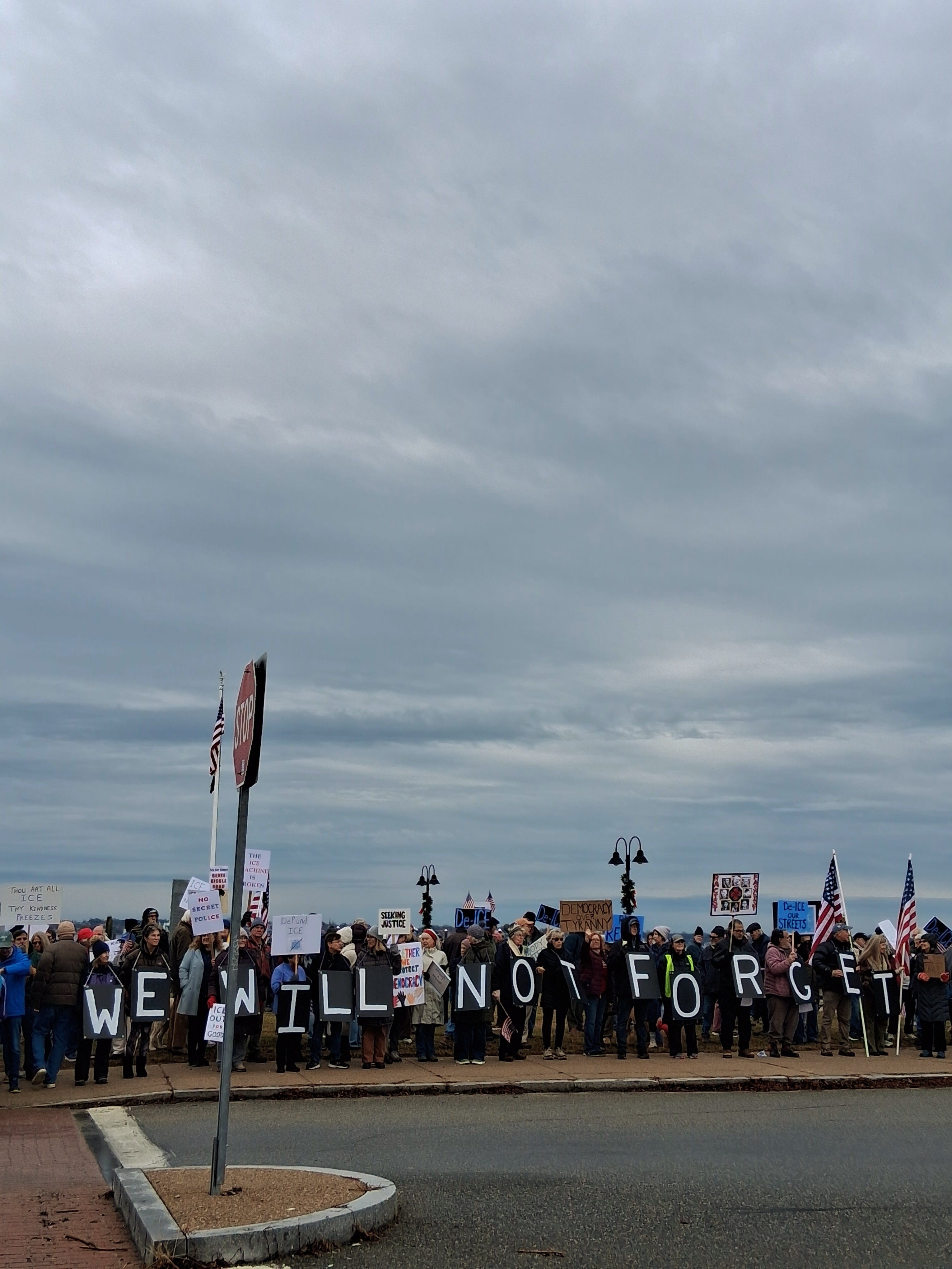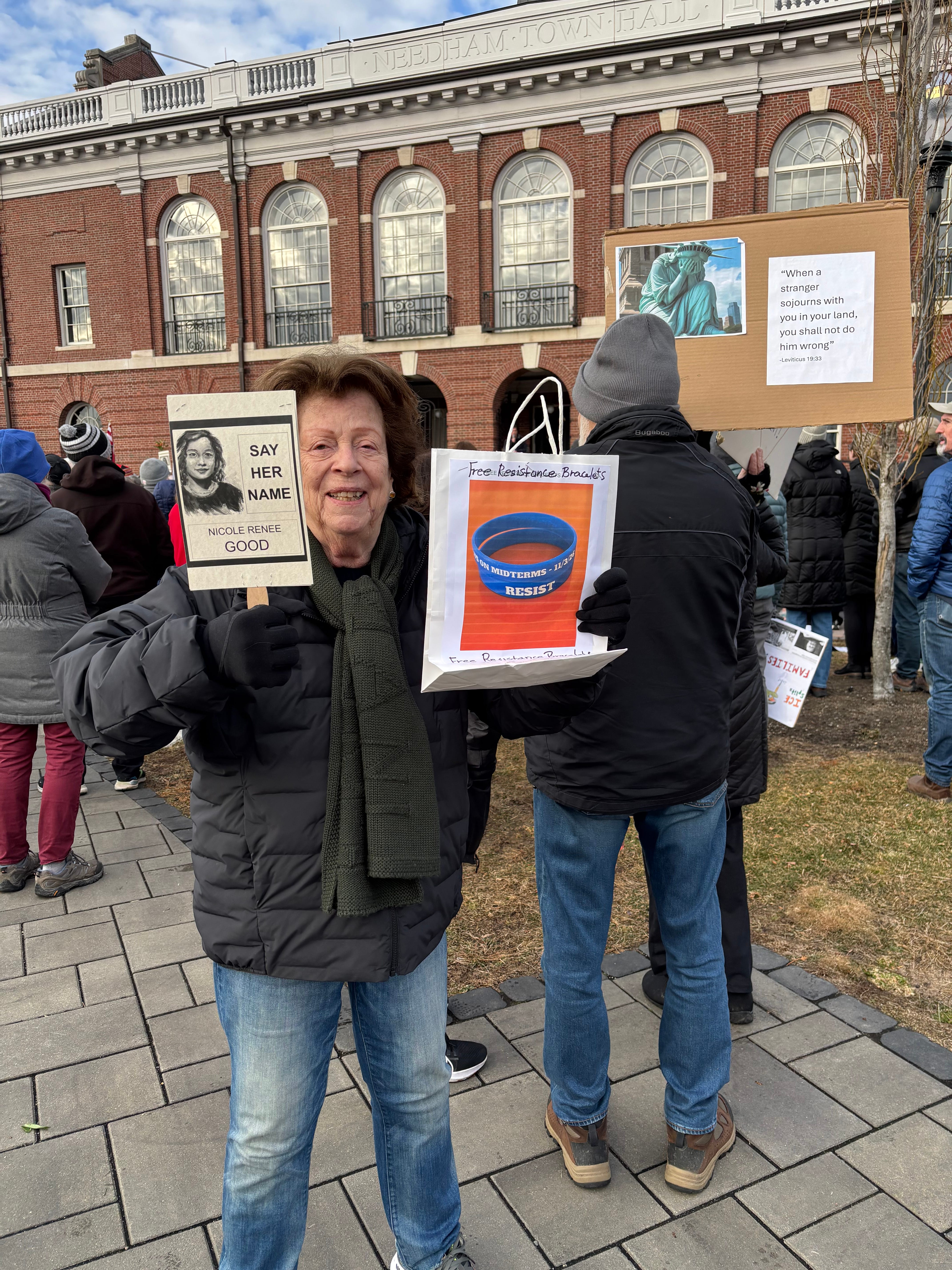 Here’s a picture I took of my partner at a Renee Good Vigil/Anti Ice Rally in Needham, MA, yesterday, where we gave out 60 of our Resistance Bracelets