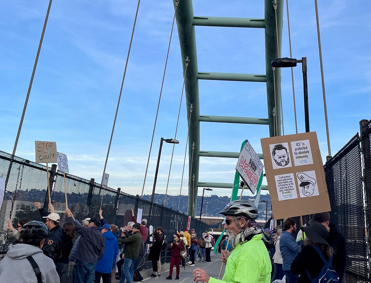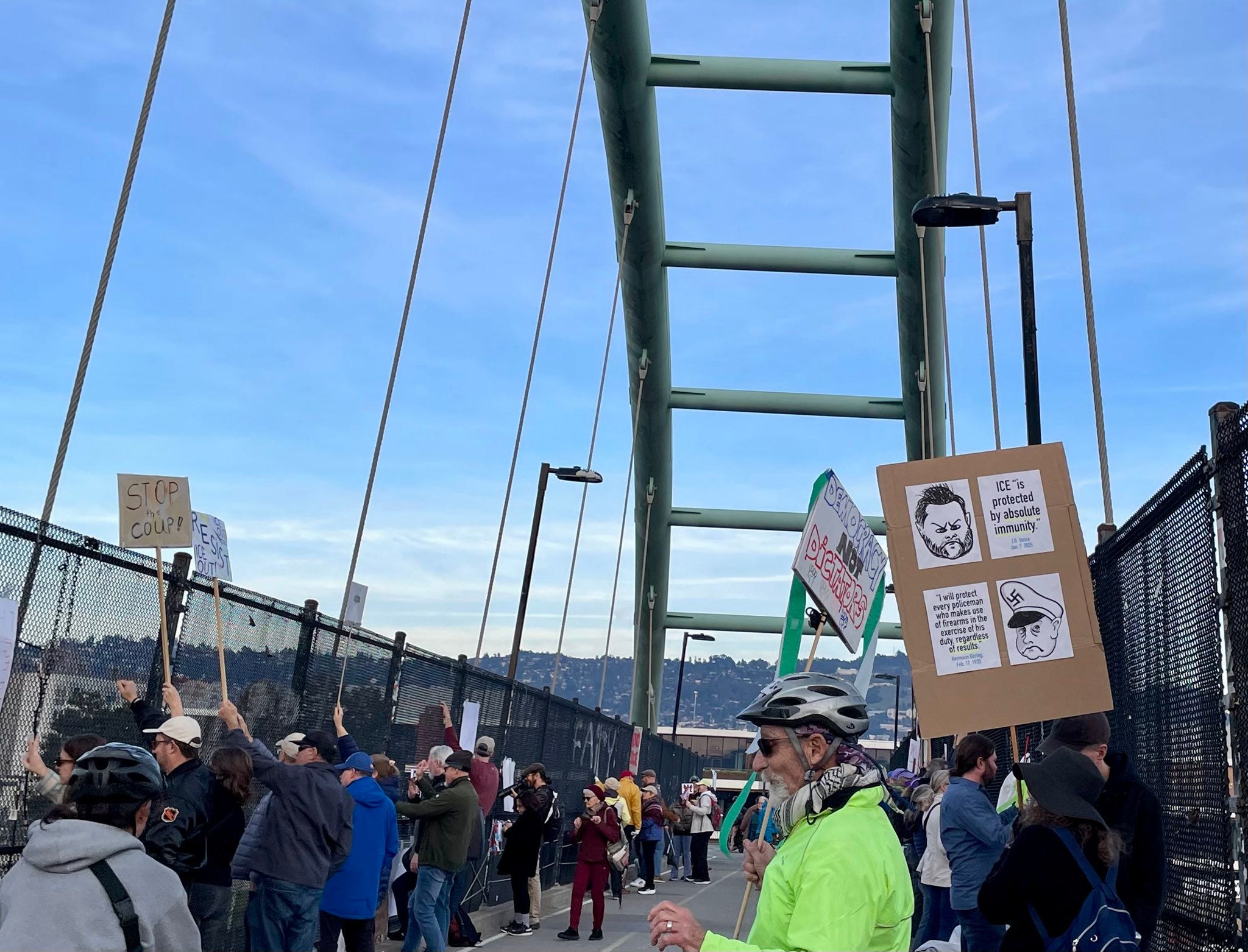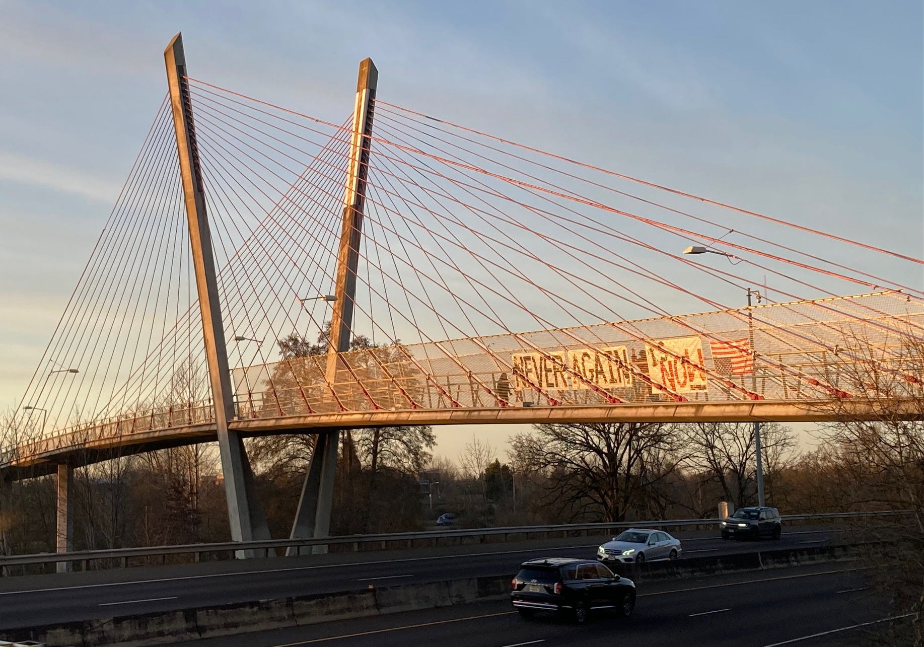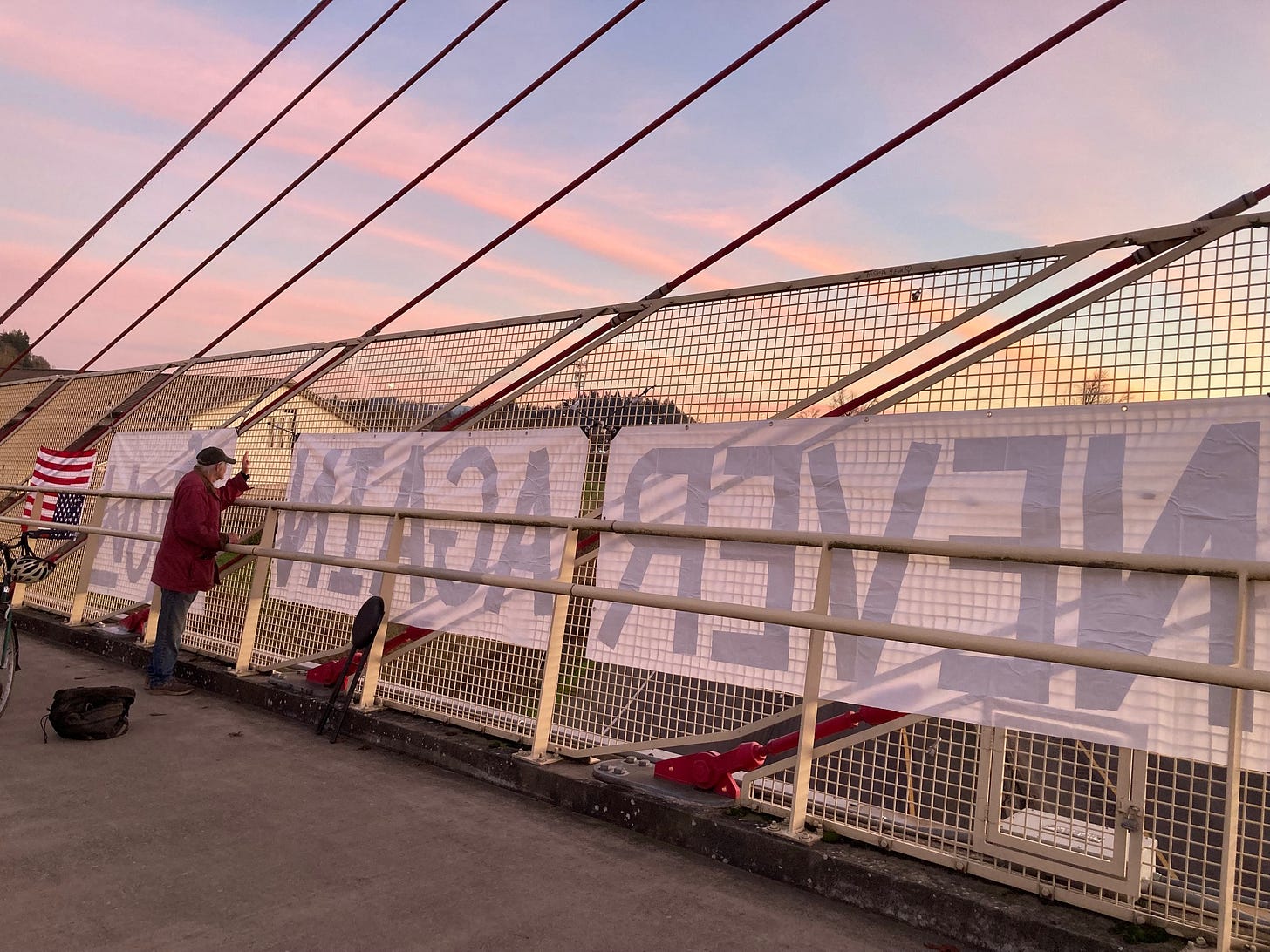 Eugene, Oregon.I recruited a new friend to help on the bike bridge this evening rush hour. People are hungry for this, and some honk even before the banners are unfurled. Never again…is now!
