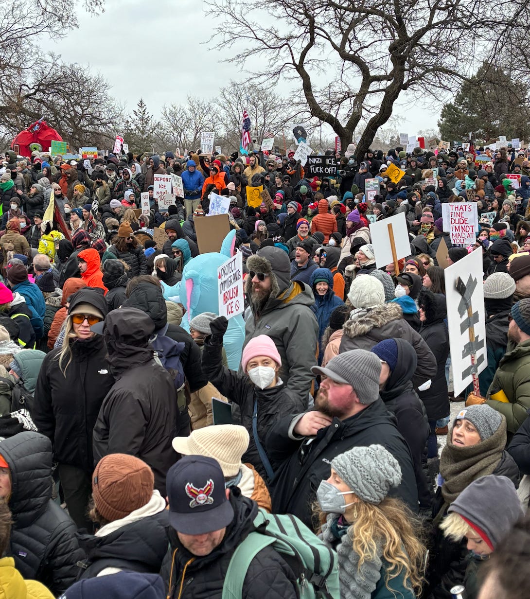 Below are two photos from the large ICE out protest and march held in Minneapolis on Saturday. The police unofficially estimated the crowd at tens of thousands of people. I have included two photos to better show the size of the crowd… There were people in costumes, a large inflatable heart in the distance, and people carrying renderings of Renee Good (orange signs). The temperature was in the low 20s.