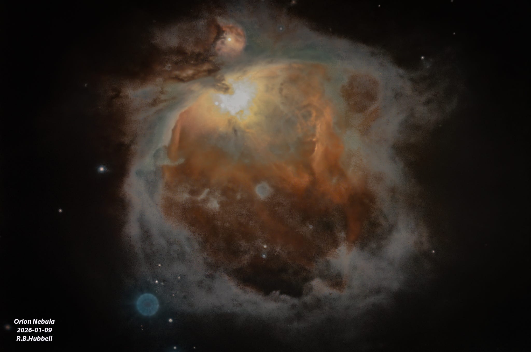 The Orion Nebula is surrounded by hundreds of stars, which sit between the observer and the nebula. To present the beauty of the nebula, I have “removed” the stars from the photo below. There are other flaws in the photo (overexposure), but the photo is what I can accomplish while also writing the newsletter. I enjoy the image, I hope you do, too!