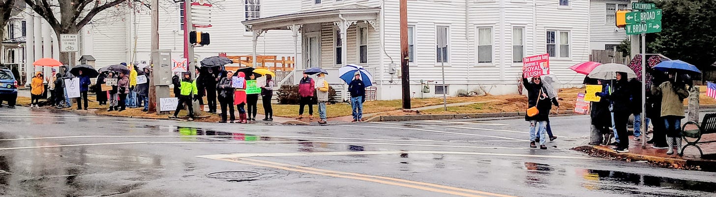Our town, Winchester, MA, had not planned any demonstrations and referred us to local towns. I organized this group, and we protested. The number of honks was gratifying. As we are not likely to show up in any official report of national participation, to whatever numbers get published, add 7!