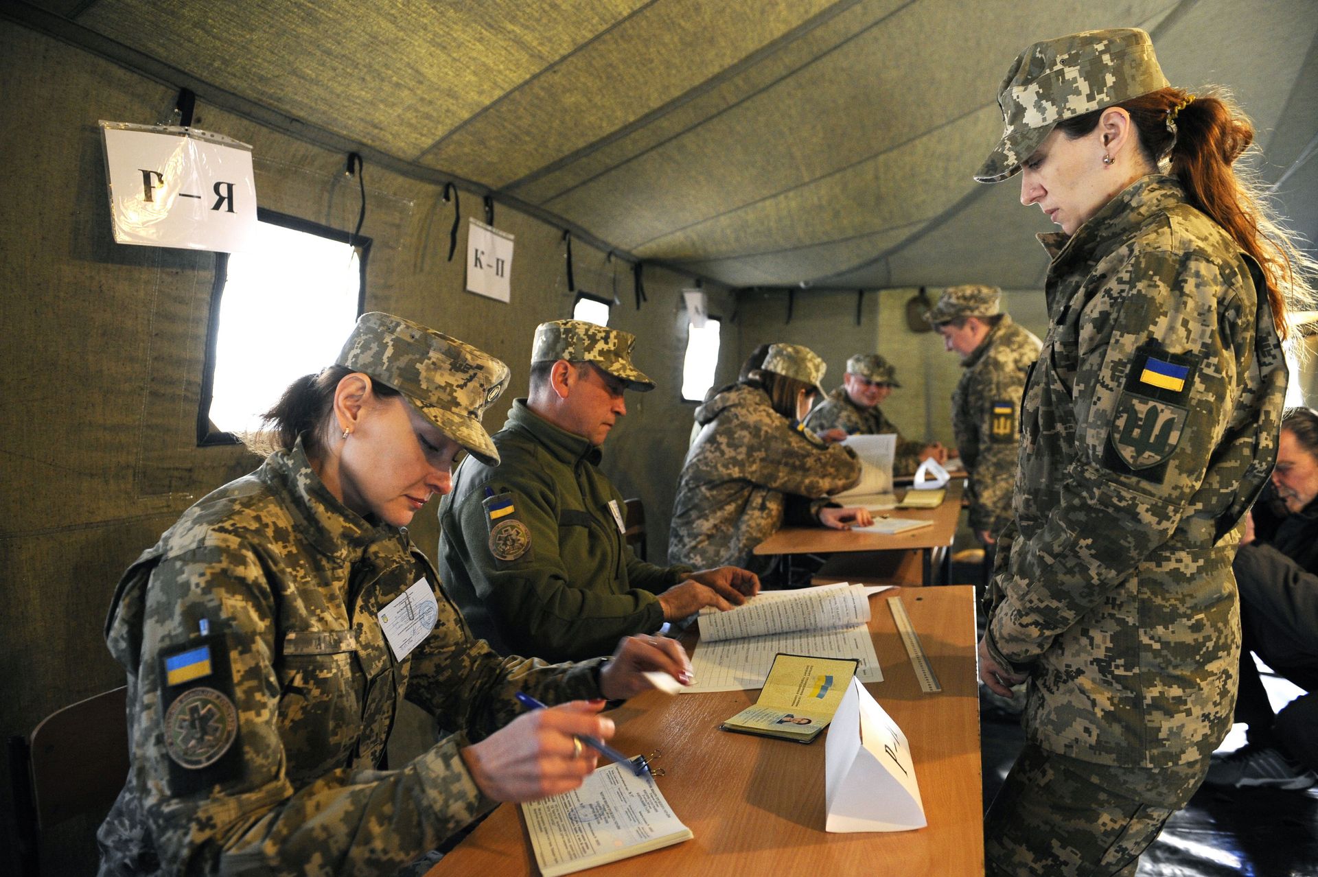A Ukrainian female servicemember has her ballot checked at a polling station in Mariupol, Donetsk Oblast, Ukraine, during the second round of Ukraine’s presidential election on April 21, 2019. (Evgeniya Maksymova / AFP via Getty Images)