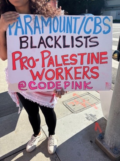 CODEPINK, hardly new to media activism, ramps up for the challenge.The LA chapter recently joined Entertainment Labor 4 Palestine to demonstrate outside Paramount/CBS studios in Hollywood. Activists waved signs that read “CANCEL PARAMOUNT” and “PARAMOUNT/CBS BLACKLISTS PRO-PALESTINE WORKERS” and “BARI WEISS CENSORS TRUTH” as Evans and the crowd tried to deliver a petition in objection to the CBS news editor’s cancellation of an expose on CECOT, the Salvadoran torture prison where Trump sent migrants-beaten by batons–to languish in windowless cells. “You cannot stay on the property … Back on the sidewalk,” ordered the guards to CODEPINK.