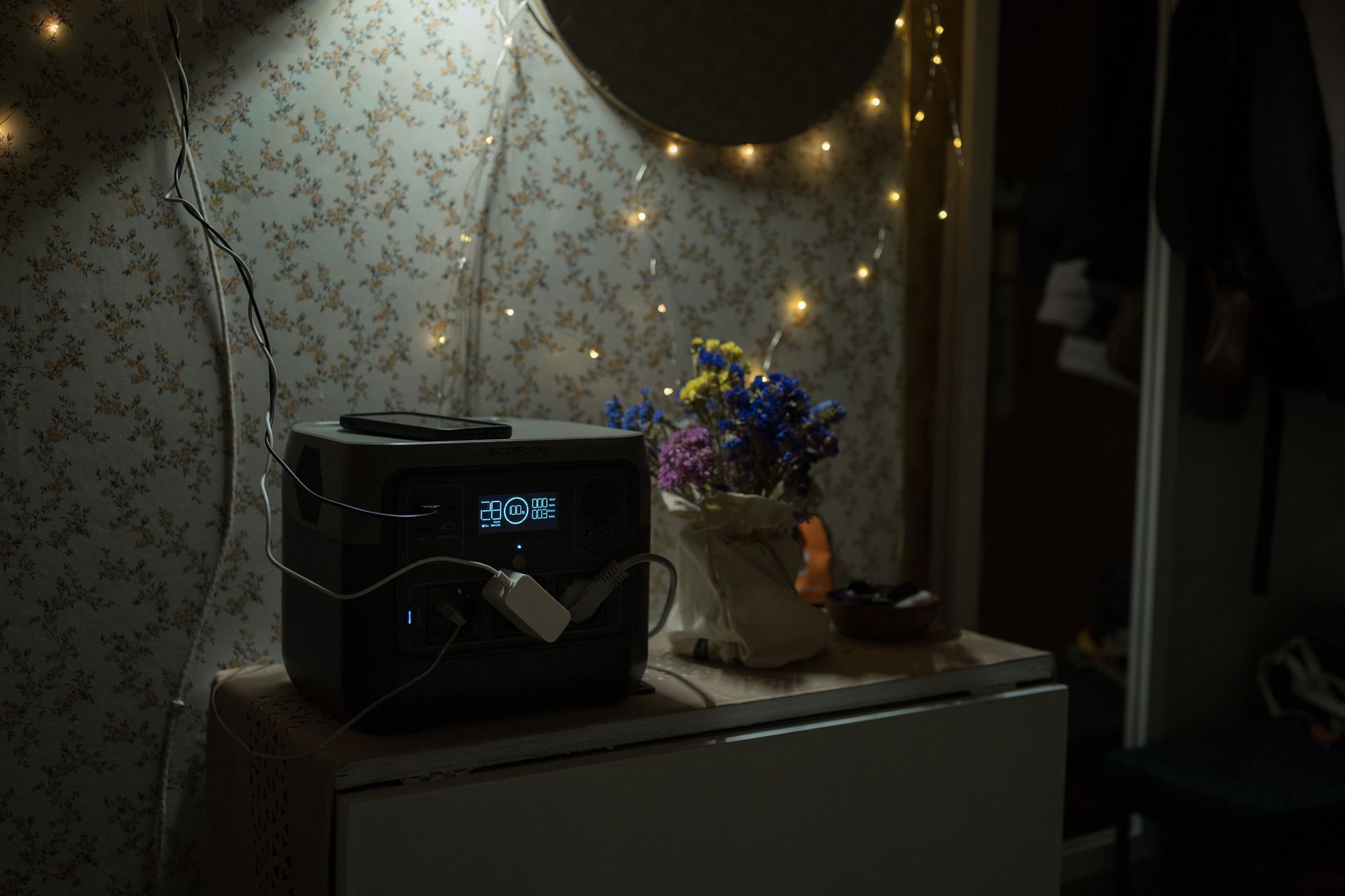 An EcoFlow portable power station is seen in Olena Bazylska’s apartment in Kyiv, Ukraine, on Jan. 13, 2026. (Elena Kalinichenko / The Kyiv Independent)